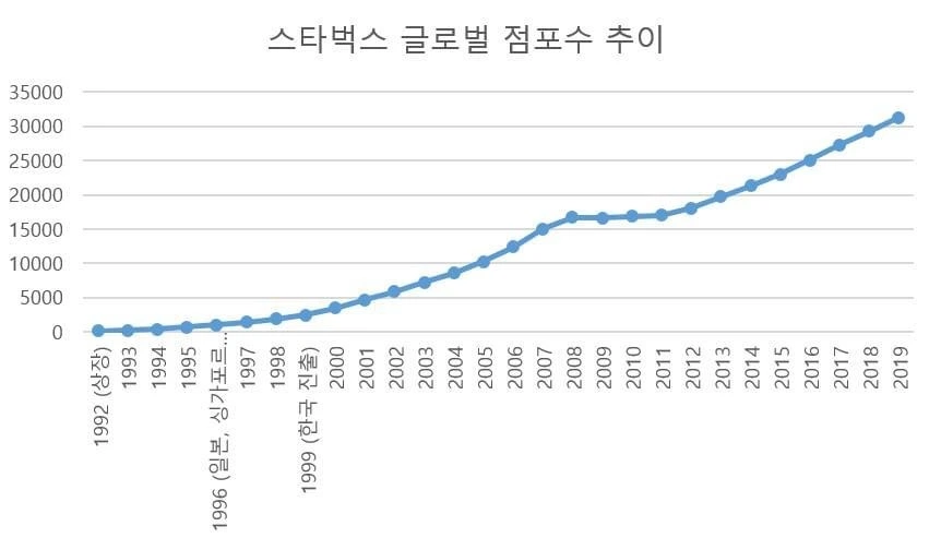 스타벅스는 지금도 그렇지만 당시엔 떠오르는 최고의 인기 브랜드였습니다. 그래서 92년에 상장할때 점포수 165개였던 것이 99년에 한국에서 첫 점포가 오픈할 땐 2498개, 현재는 31000개가 넘죠. 이런 강력한 브랜드가 초장부터 들어와서 시장을 개척하고 있으니 0에서 시작해야하고 출발도 늦은 경쟁자들이 제대로 상대하기 힘들 수 밖에요.