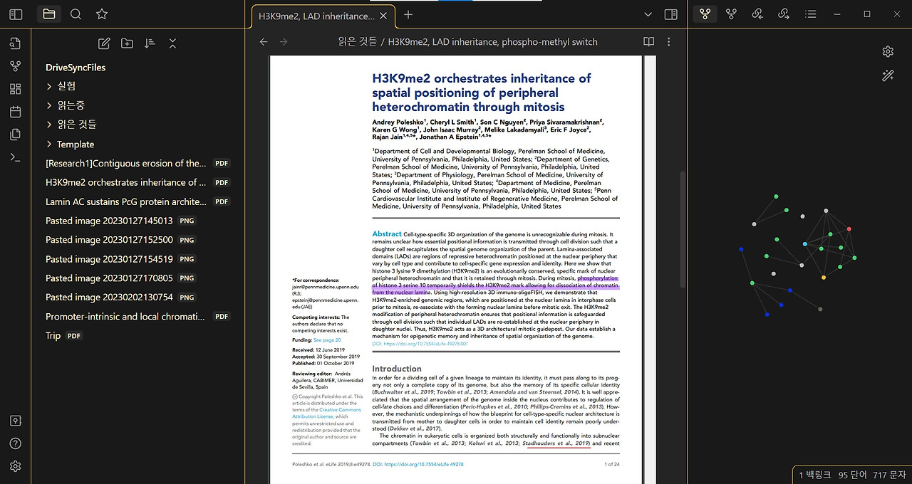 최대한 간략하게 중요한 내용만 뽑아 정리하고, 해시태그를 달아 같은 주제를 가진 논문들과의 연결 선을 만든다. 연관된 내용의 논문이 있다면 직접 그 논문과 연결 선을 만들 수도 있다. 옵시디언 활용법에 관해서는 이미 유튜브에 친절하게 잘 설명되어 있는 영상이 있으니 이를 참고하도록 하자. 정보 사이의 연결관계를 이용하는 메모 방식인 제텔카스텐(Zettelkästen)에 대한 내용도 알아두면 도움이 될 것이다.