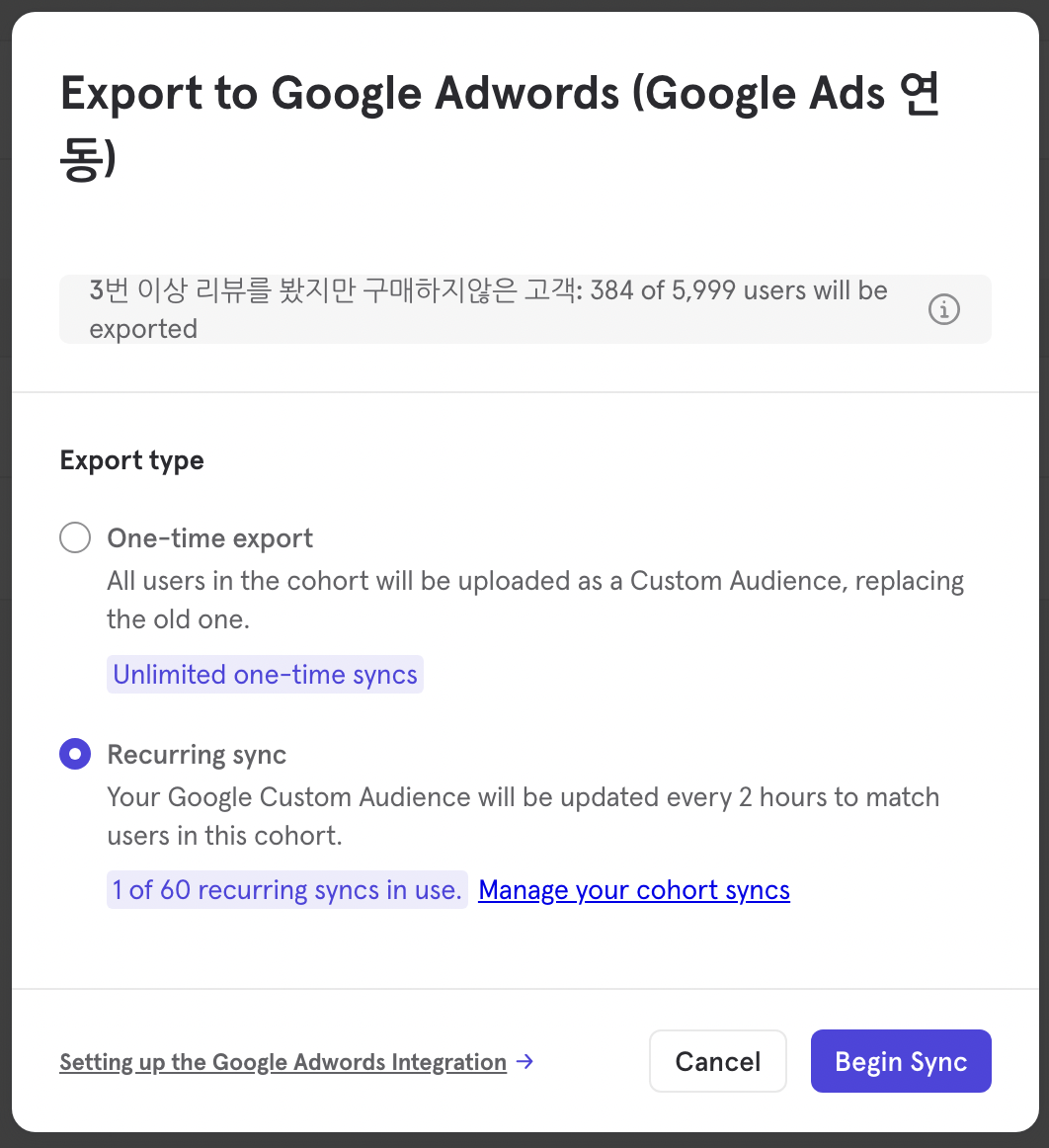여기서 반복적으로 리타게팅 타겟을 업데이트할 예정이므로 Recurring sync (2시간 단위로 믹스패널 코호트를 배치성으로 보내주는 기능으로 무료로 사용 가능)를 클릭합니다.