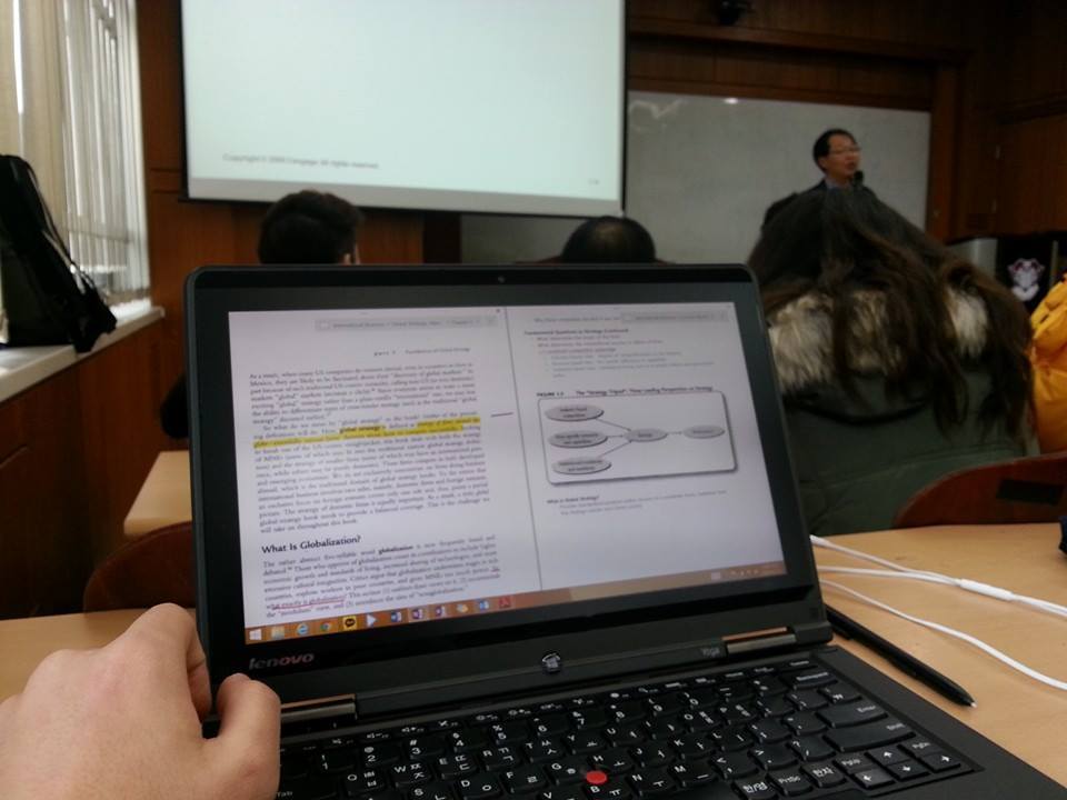 아마도 그다음엔 수업을 들으러 강의실로 이동해 맨 앞자리에 앉아서 아까 본 태블릿 PC를 펼쳐놓고 키보드를 뗐다 붙였다, 가끔은 키보드로, 가끔은 펜으로 요란하게 필기를 하다가, 어떨 땐 태블릿을 들어서 교수님의 판서나 PPT를 찍고 다시 태블릿 PC에 키보드를 연결시켜 필기하는 모습을 볼 수 있었을 것이다. 교수님과 친구들은 신기한 모습으로 나를 쳐다봤다.