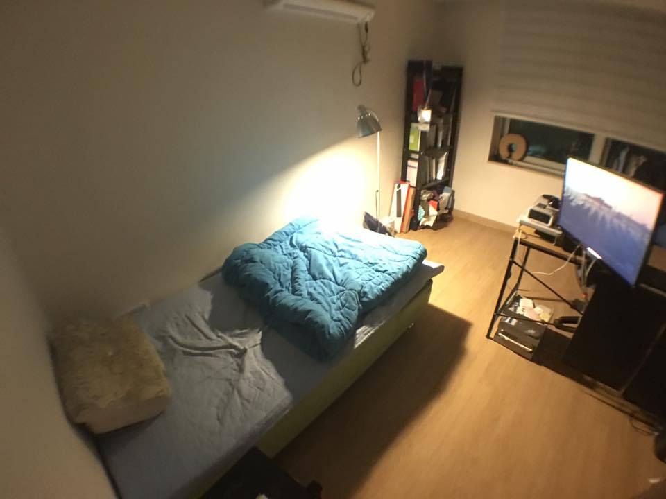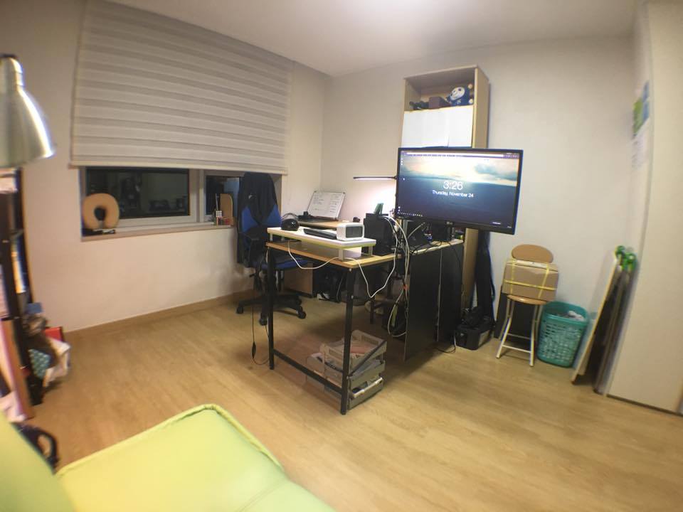 2016년 자취방 구조를 바꾼 뒤 찍었던 사진이다. 이땐 모니터암을 쇼파베드 쪽으로 돌릴 수 있게 설정 함으로써 TV도 볼 수 있고 노트북 듀얼모니터로도 사용할 수 있었다.