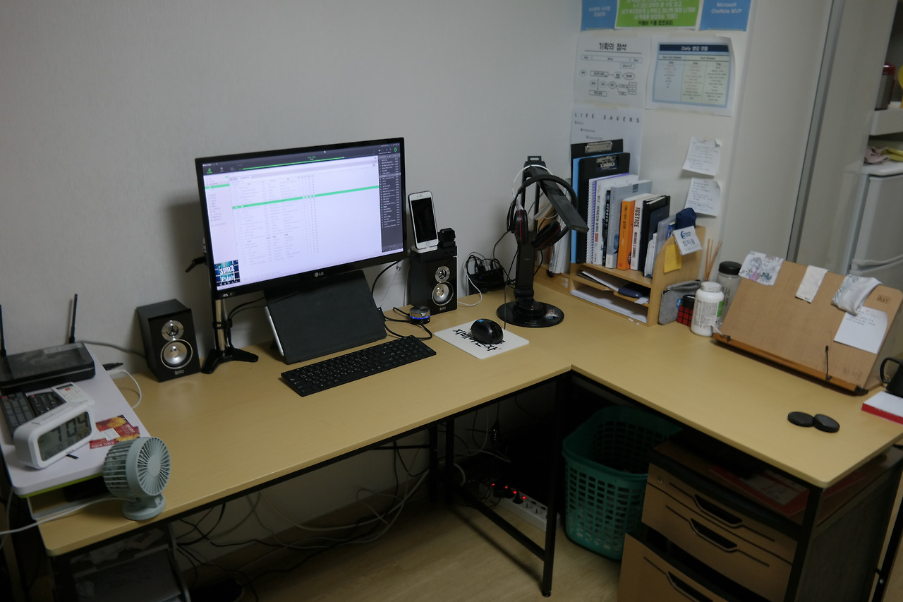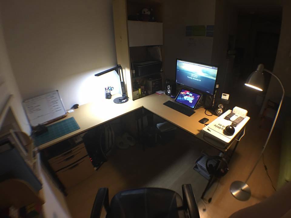 인터넷에서 찾으면 온갖 화려한 작업공간을 많이 볼 수 있는데, 필자는 그정도로 작업공간을 투자할 여건이 안되기 거기에 비해서는 초라하다(ㅎ;;). 그럼에도 불구하고 나에게는 부담 없이 최고의 생산성을 발휘할 수 있는 공간이다. 다시 강조하지만, 자신이 편할 수 있는 환경이면 어디든 좋다!