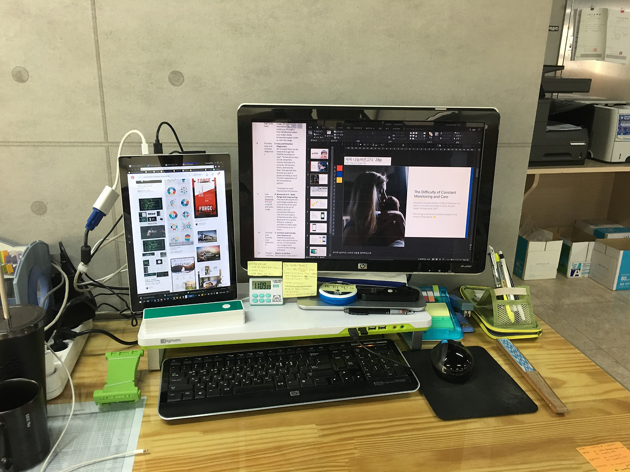 그리고 카페를 가서는 또 이렇게 휴대용 듀얼모니터를 연결시켜 태블릿 PC로 작업을 하다 집에 가져와 코드 하나만 연결하면 또 다시 나만의 데스크탑이 완성되는 것이다!