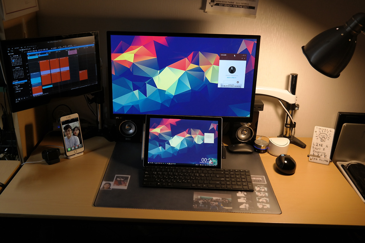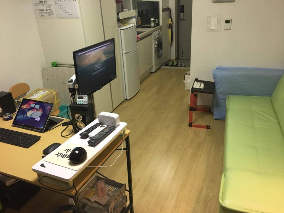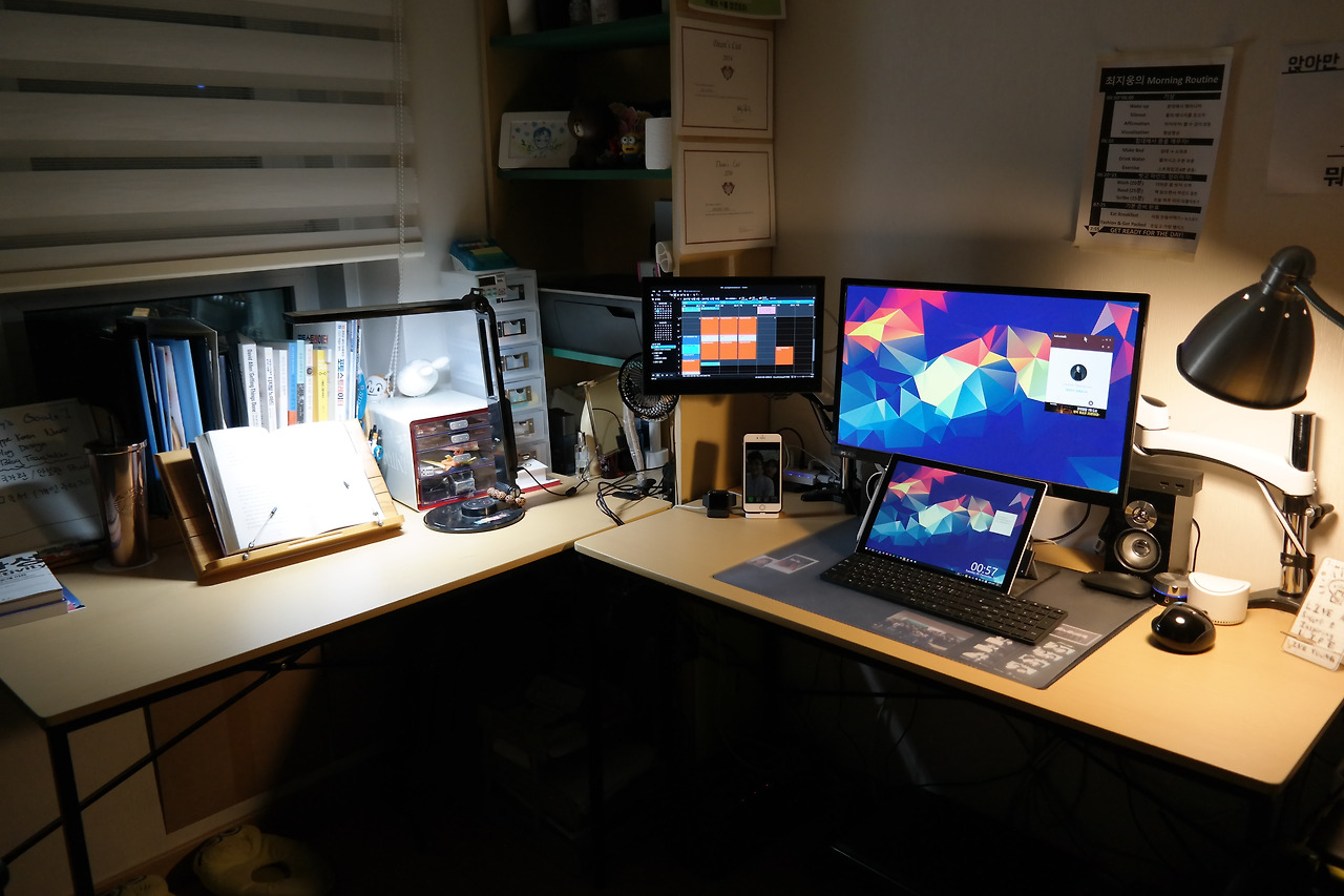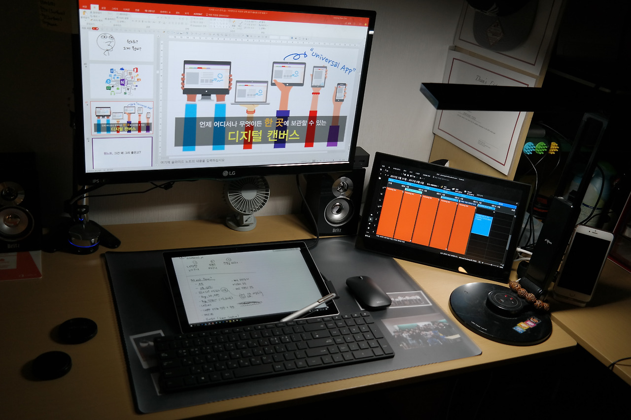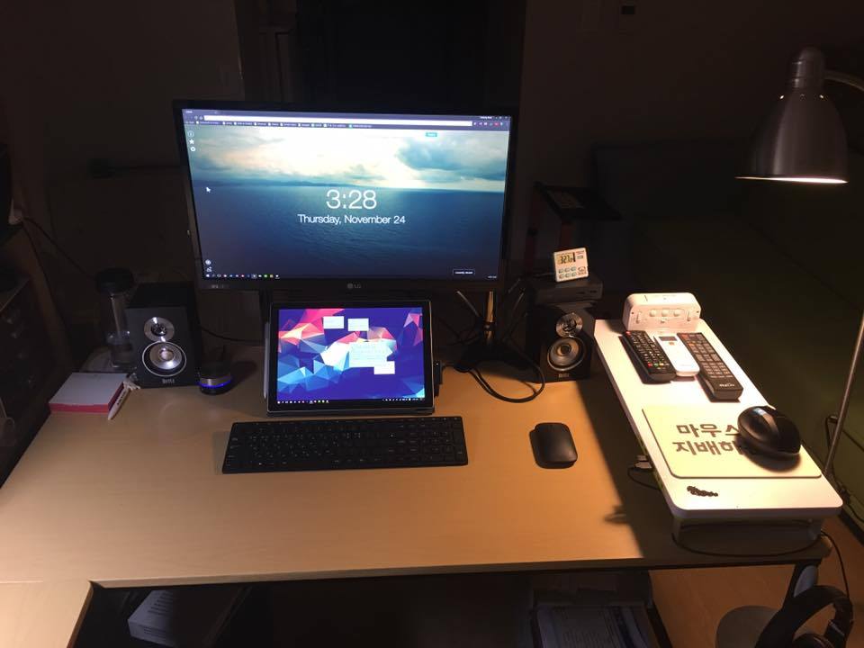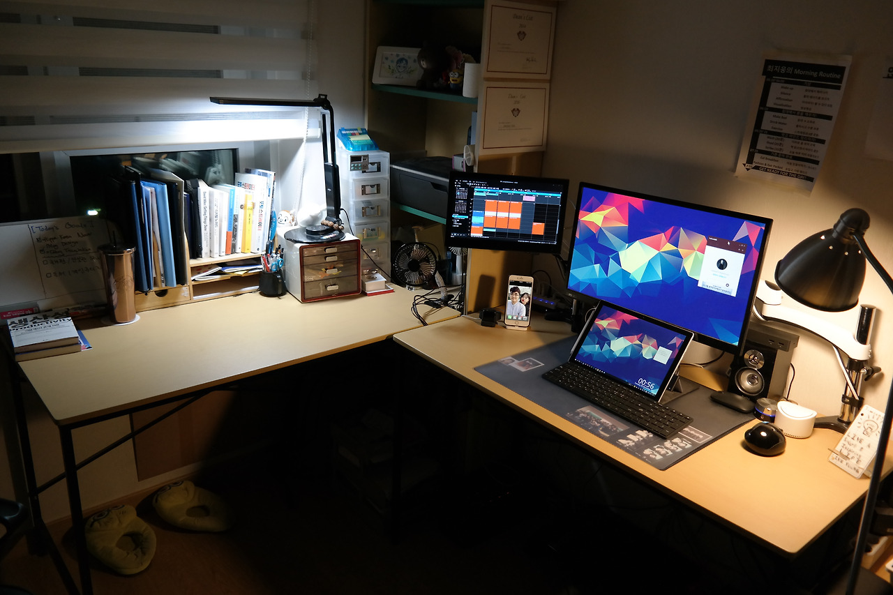 2017년 수원에 자취했을 때 자취방의 작업공간의 모습. 프레젠테이션을 편집하고 있었을 때의 모습이다. 사진을 보면 데스크탑이 이 모든 것을 돌리고 있는 것으로 보이지만, 서피스 프로 태블릿 PC가 무거운 파워포인트, 디지털 태블릿, 스피커, 모니터들을 포함한 모든 주변기기들을 작동시키고 있다.