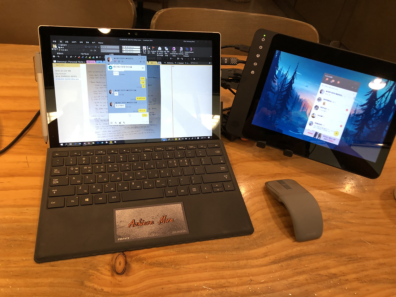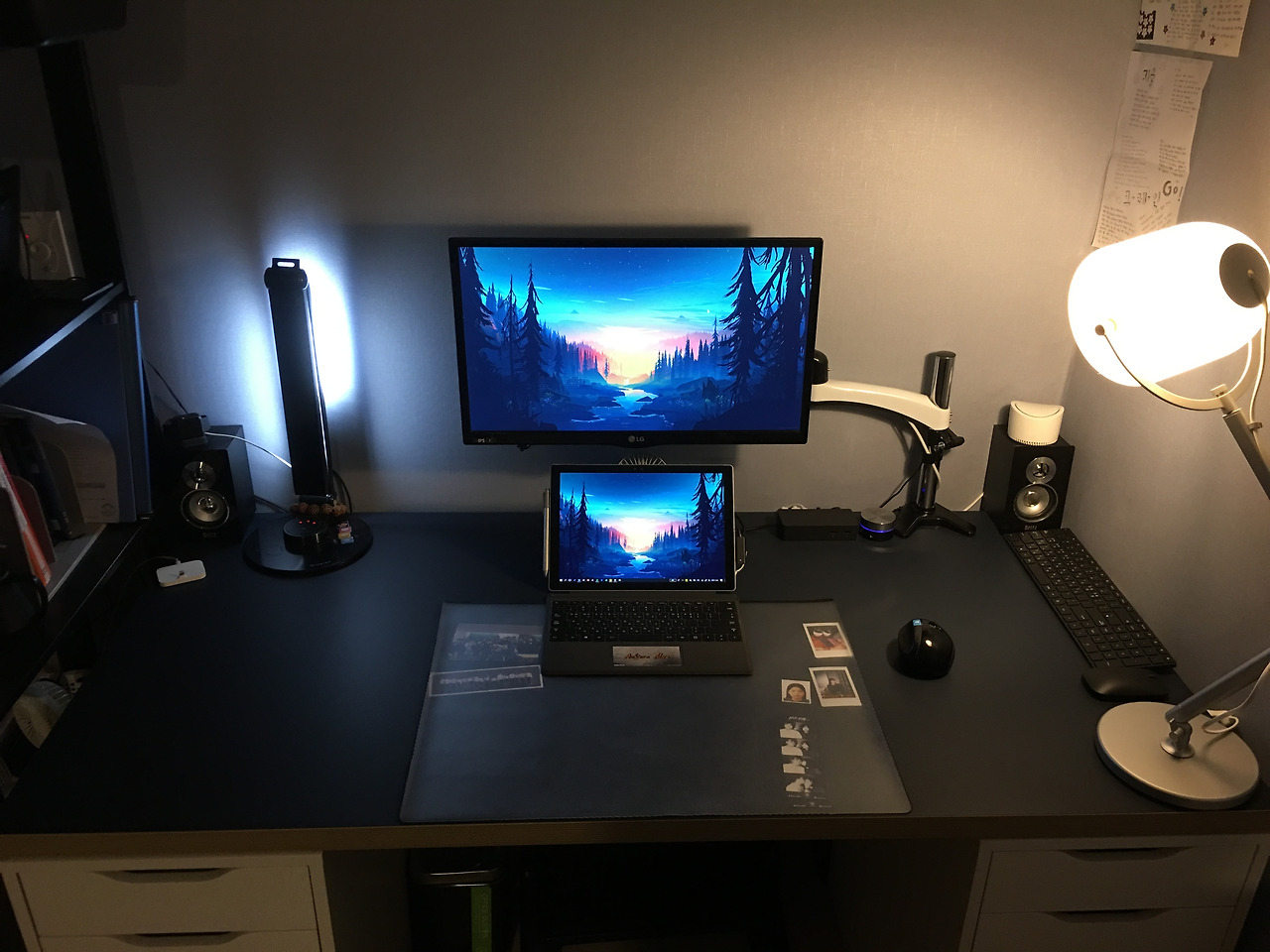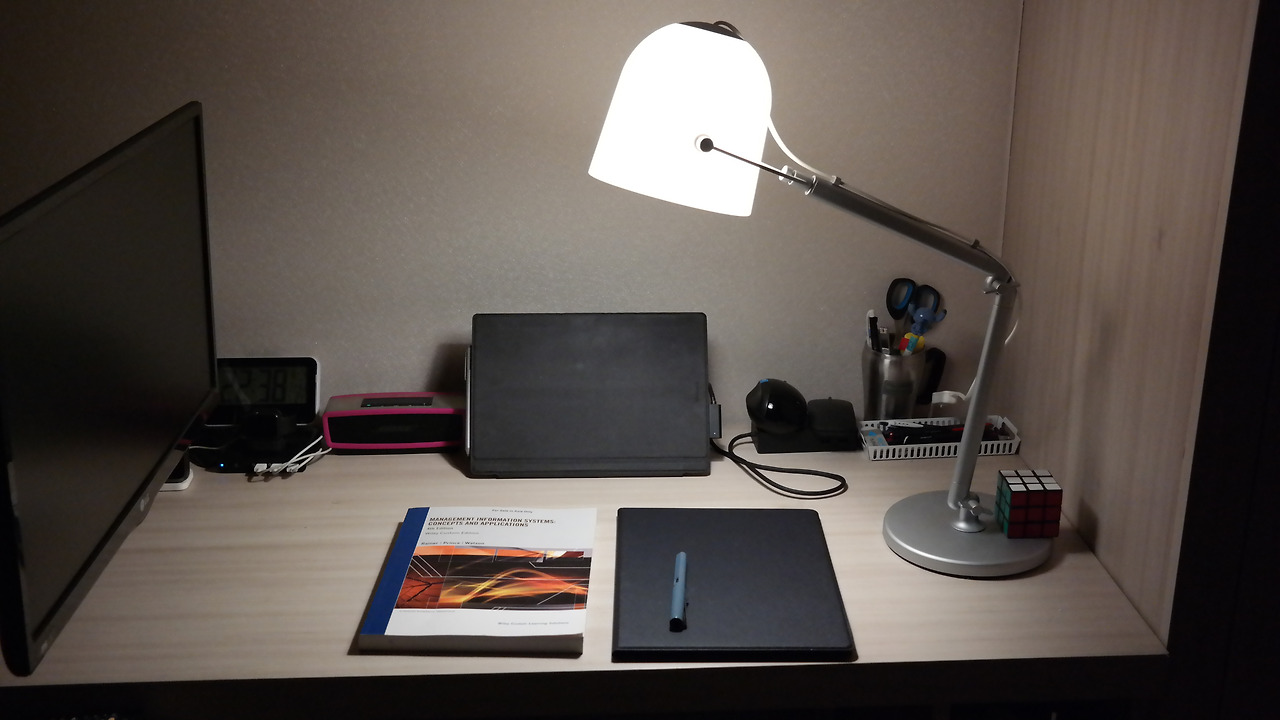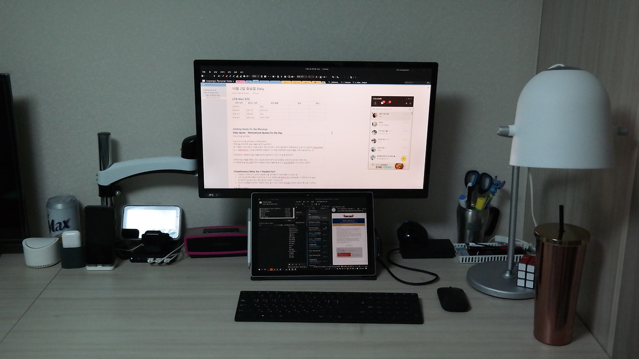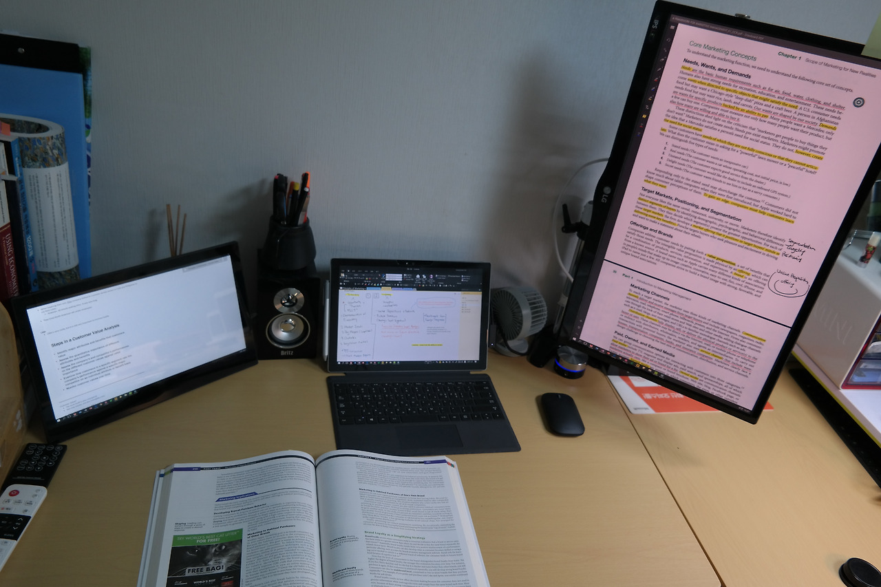 2017년 수원에 자취했을 때 자취방의 작업공간의 모습. 프레젠테이션을 편집하고 있었을 때의 모습이다. 사진을 보면 데스크탑이 이 모든 것을 돌리고 있는 것으로 보이지만, 서피스 프로 태블릿 PC가 무거운 파워포인트, 디지털 태블릿, 스피커, 모니터들을 포함한 모든 주변기기들을 작동시키고 있다.