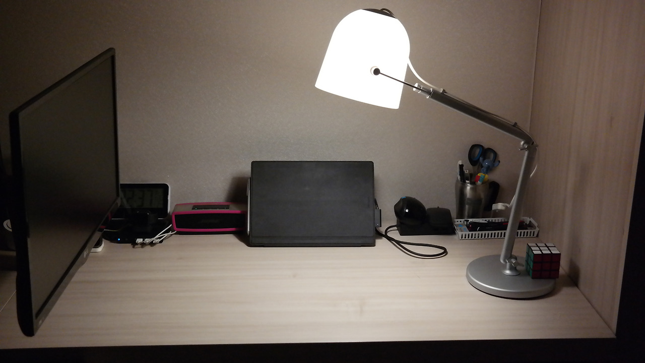 필자는 모니터를 데스크 좌측으로 돌리면 작업 공간의 좌측을 막아 일종의 '독서실'을 만들 수 있다. 우리가 학창시절 때 독서실을 이용했던 것은 공부 공간의 좌우가 다 차단되고 공부하는 공간에만 딱 빛을 및춰주기 때문에 집중을 잘 할 수 있기 때문이 아니었는가? 필자의 책상 우측은 벌써 벽으로 막혀있기에, 모니터로 좌측을 막아주면 그 학창시절 독서실 다니던 느낌을 재현할 수 있다.