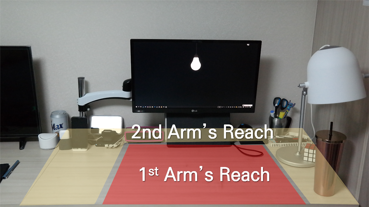 나의 데스크 앞, 어깨넓이로 내 몸앞 데스크 앞 부터 팔꿈치 까지의 길이 정도의 공간, 팔과 손이 움직일 내 책상 바로 앞은 깔끔히 유지해주는 것이 좋다. 이 공간이 1st Arms Reach라는 라는 공간이다. Arm's Reach, 몸을 움직이지 않아도, 닿을 수 있는 공간이다. 이 영역은 내 손으로 직접 어떤 작업이 이루어지는 공간이다. 어떤 작업을 할 때 1st Arms Reach에는 물건이 놓일 수 있다. 당연한 일이다. 그런데 작업이 끝난 후로는 치워주도록 하자.