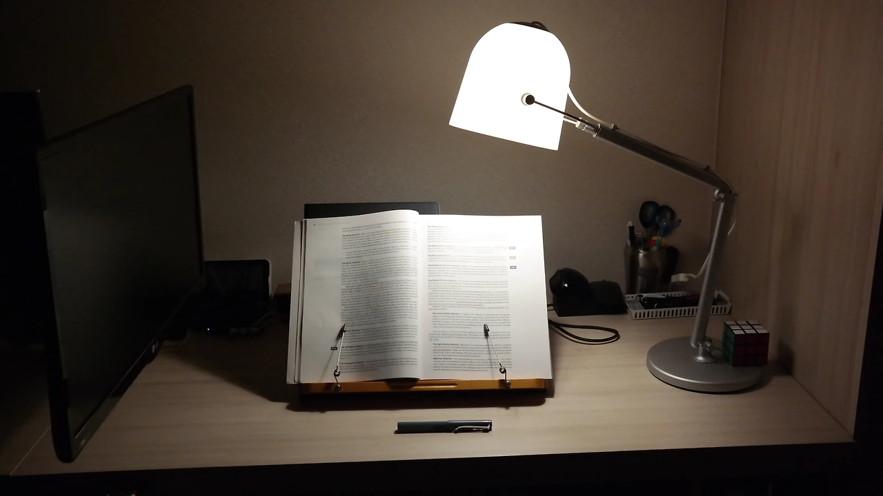 책상 스탠드도, 컴퓨터 화면도 따뜻한 색을 선택한 이유는 빛의 온도와 눈 피로와 관련된 것 때문이다. 따뜻한 색의 빛일 수록 빛은 다소 어두워지지만 눈에 피로가 덜하다. 블루라이트를 줄여주기 때문이다. 낮에는 백색 광을 해도 상관 없지만, 특히 해가 진 후 야간에 작업을 한다면 따뜻한 빛을 비춰주는게 눈의 피로에도 덜 하고 집중도 더 잘 된다. 장시간, 그리고 야간에 작업할 필요가 있으면 따뜻한 빛의 스탠드를 사용해보자.