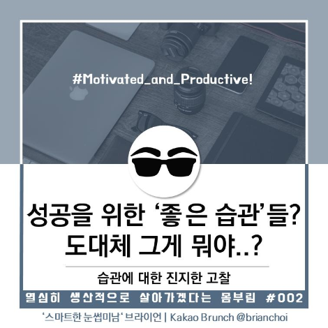 좋은 습관을 갖고자 하는 몸부림을 치는 여러분들에게도 도움이 되고 '왜 무엇이 좋은 습관인가' 받아드릴 수 있는데 도움이 되는 글이었으면 좋겠다.