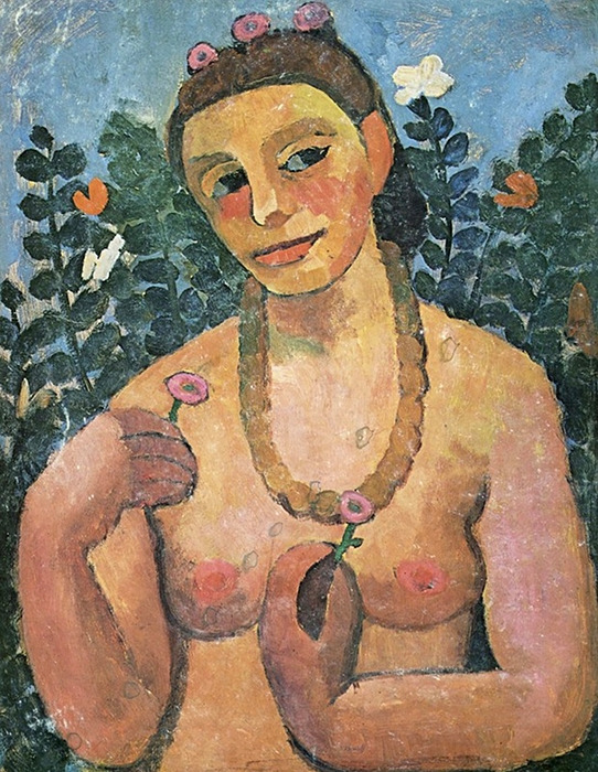 그러나 그림을 보면 알겠지만 그 '충격적인' 작품은 사실 굉장히 차분하다. 역시 지나친 감정을 배제한, 적절히 냉철하고 적당히 따스한 시선으로 스스로를 화폭에 담아냈다. 한결같이 강직한 눈빛은 한 곳을 흔들리지 않고 응시하며 담담함을 드러낸다. 인물을 둘러싼 배경과 인물이 쥐고 있는 꽃, 혹은 인물이 감싸고 있는 부른 배는 당시 파울라의 삶이 머물고 있던 순간을 표현한다. 붓을 든 그 순간, 파울라 자신의 있는 그대로를 그려낸 것이다. 남성 작가의 시선에서 바라본 여성의 나체는 때로는 관능적이고, 때로는 연민을 불러일으키며 타자화되어 있다. 서로 다른 성별이니 당연한 것이다. 그런 누드화들이 대부분이던 시대에, 아무것도 꾸며내지 않은 파울라의 누드 자화상은 역시 당연하게도 충격적이었을지 모른다.