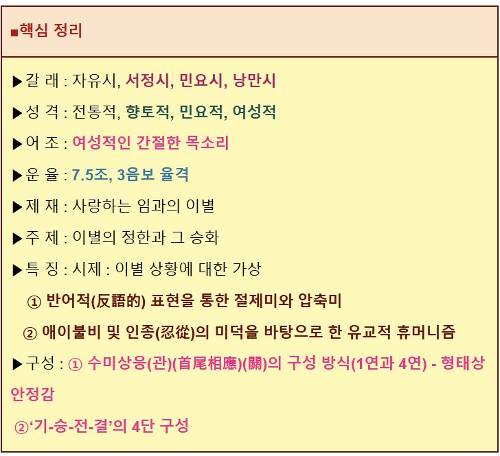 자, 어떤가요? 이 시를 어떻게 읽을까 하고 고민하기도 전에, 문제집이나 시험대비용 전과에는 아래와 같은 내용으로 정리되어 있습니다.