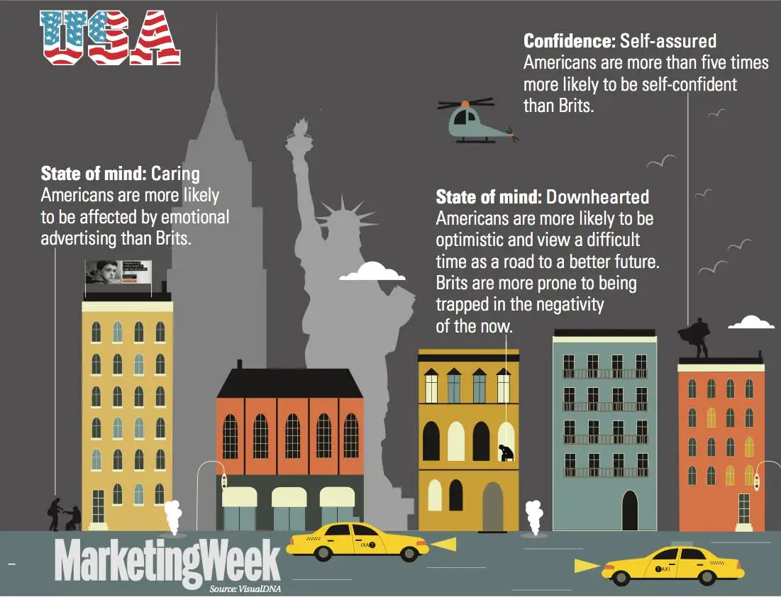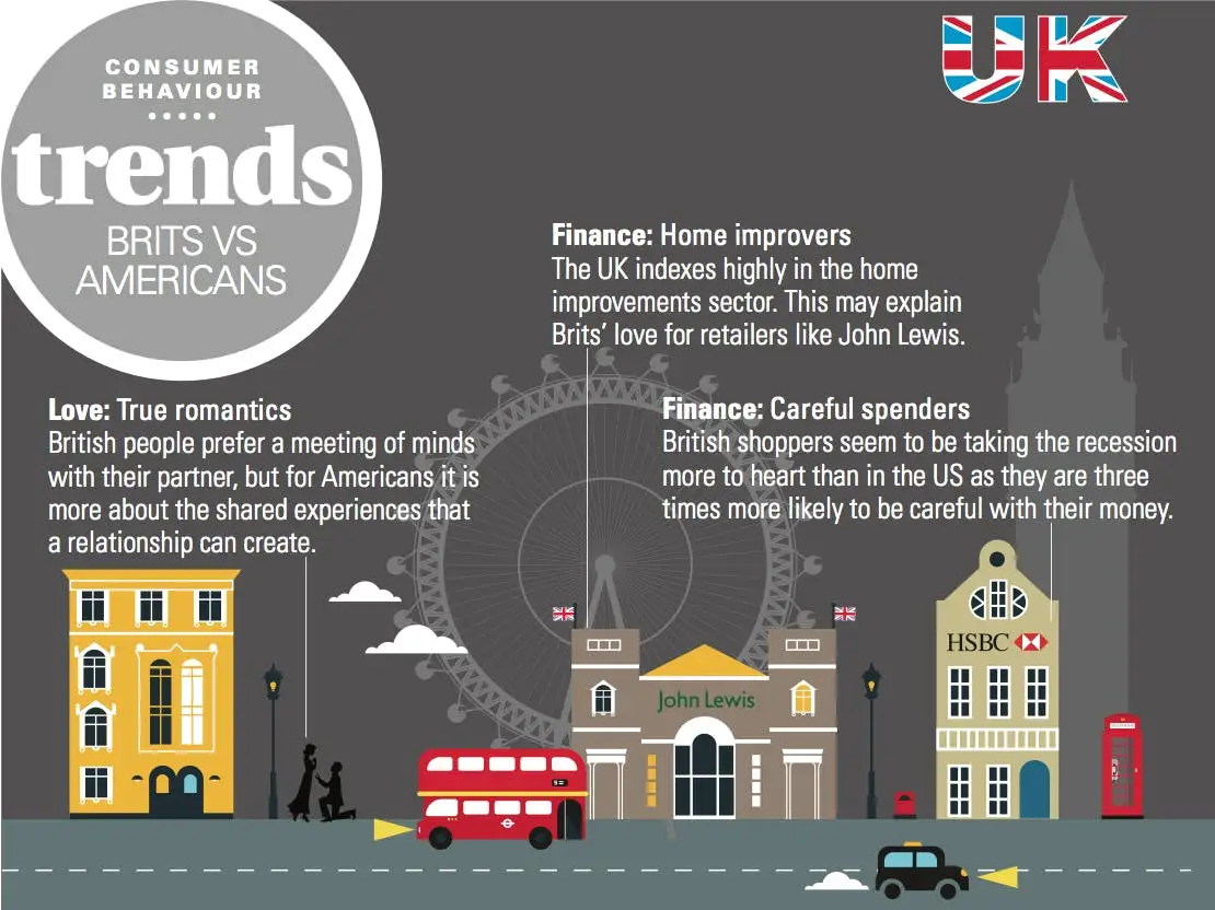 Visual DNA라는 리서치 회사가 2013년도에 진행한 연구에 따르면, 영국인은 미국인보다 소비를 하는 데 있어서 신중하게 지출할 가능성이 3 배 더 높다고 합니다. 이 연구는 영국인 10,000명, 미국인 10,000명, 총 20,000 명의 소비자를 대상으로 진행이 되었습니다.