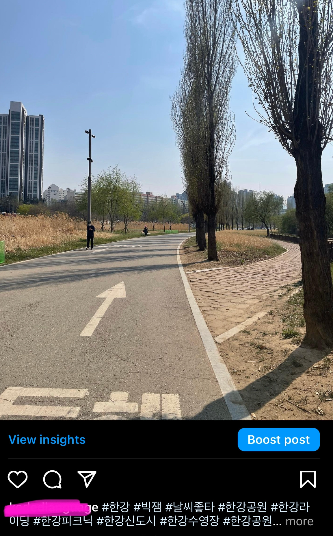 여기 캡션에도 보시면 #한강에 관련한 단어가 너무 많이 중복되어 있죠- 물론 사진도 한강에서 찍은 사진 이긴 합니다만 이렇게 많이 복붙 하다시피 캡션을 만들면 인스타그램 알고리즘이 스팸성 포스팅으로 인지할 가능성이 있어요. 물론 이 기준도 시기에 따라, 알고리즘 프로젝트마다 스팸성 포스팅을 정의하는 기준이 달라집니다. 그렇지만 이렇게 한눈에 봐도 해쉬태그가 많아 보이는 것은 유저의 입장에서 보았을 때도 그다지 가독성이 좋지 않습니다. 이런 상황은 최대한 피하는 게 좋겠죠~