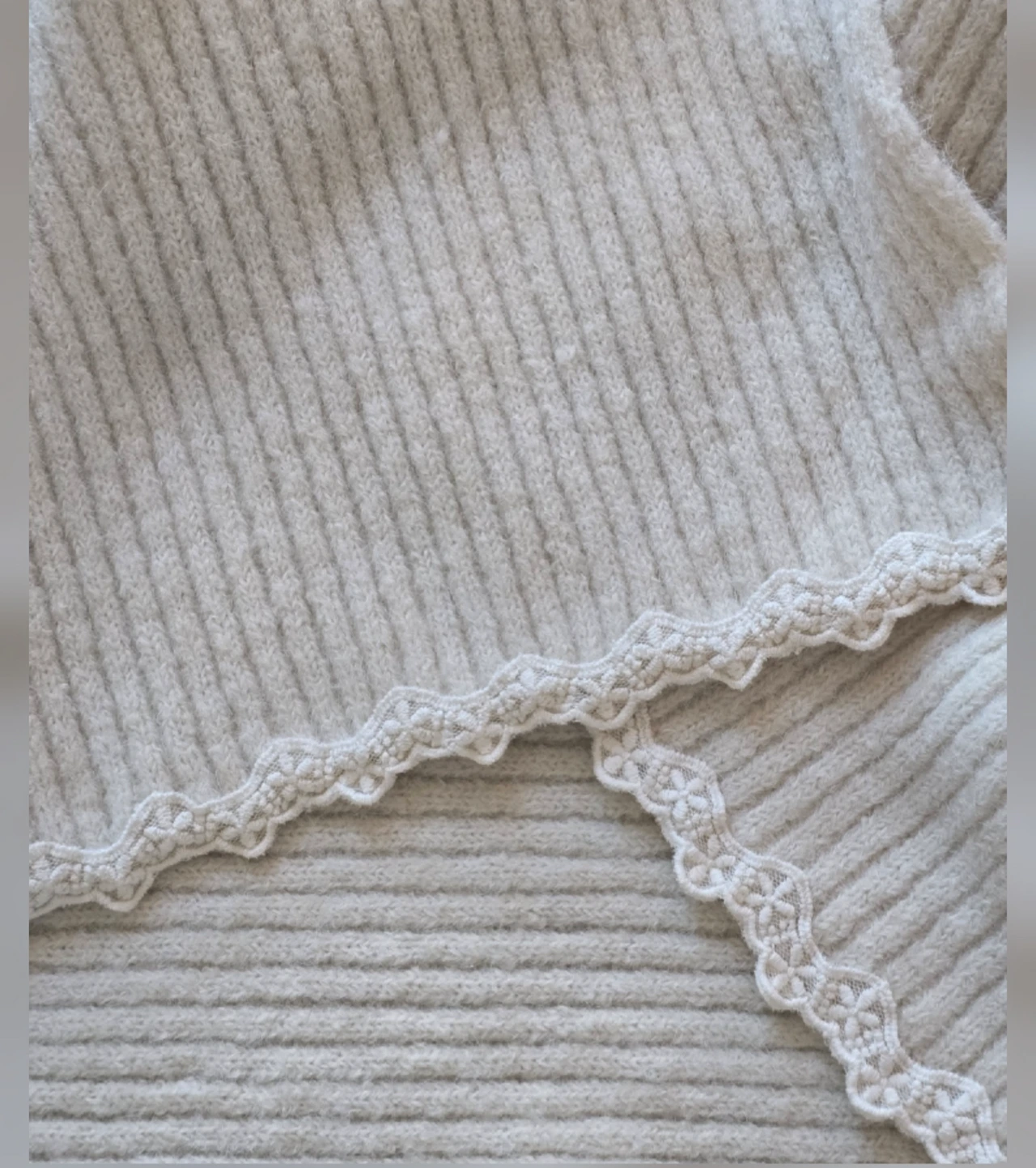 식서 부분은 마감이 잘 되어 있으니까 푸서 부분을 풀러 그 실을 이용하여 코바늘로 떠서 예쁘게 마감을 해야겠다고 계획을 세웠다. 푸서 부분을 가위로 조금 잘라내고 실을 풀려고 많은 시간을 보냈다. 실을 잡아당기면 술술 풀릴 거라고 생각했는데, 집어 뜯고 긁어내려도 실이 풀리지 않았다. 두 가지 원단 모두 푸서부분의 실을 푸는 것은 실패. 참 이상했다. 할 수 없이 다른 방법을 찾아야만 했다. 생각 끝에 바이어스 처리를 하기로 결정했다. 그냥 원단으로 바이어스 처리를 하면 너무 이상할 것 같았다. 내가 가지고 있던 이것저것을 뒤지다 레이스를 발견했다. 레이스로 마감을 하면 좀 특이할 것 같았다. 니트 원단에 대어보며 어울릴 만한 2종류의 레이스를 골랐다.