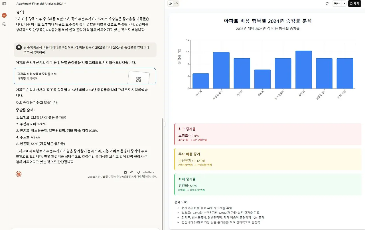 덕분에 우리 아파트 재무제표도 AI 챗봇이랑 같이 분석해 봤잖아. 예를 들어, 손익계산서 데이터를 AI 챗봇에게 주고 "이 데이터에서 가장 큰 비용 항목 5가지를 찾고, 각 항목의 전년 대비 증감률을 분석해서 요약해 줘."라고 물어보는 거야. 그럼 얘가 텍스트로 깔끔하게 요약해 줘. 함수나 통계 지식 없이도 이런 심층 보고서 작성이 가능해지는 거지! 특정 계정 과목의 추세 분석이나, 예상치 못한 비용 발생에 대한 인사이트를 얻을 때 정말 유용하다고!