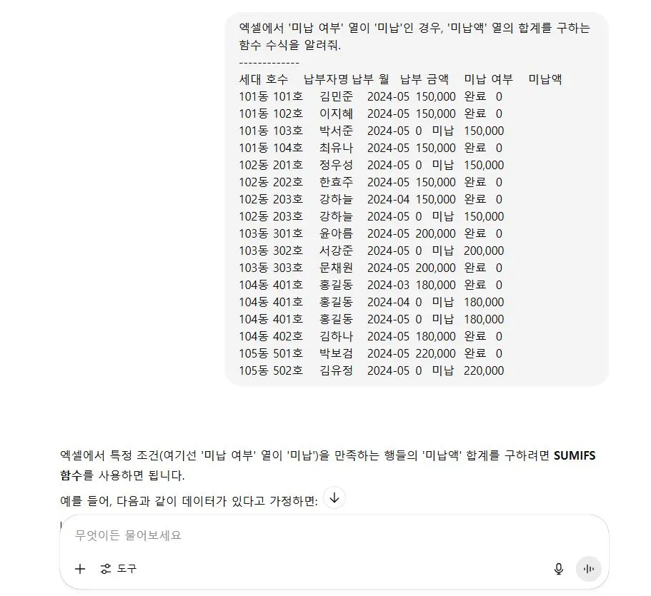 김 소장: 천만에! 나도 너처럼 기본 함수는 눈 감고도 썼어. 근데 얘가 알려주는 건 차원이 달라. 예를 들어, 내가 미수 관리비가 특정 금액 이상인 세대만 따로 골라서 총액을 계산하고 싶을 때가 있거든? 예전엔 일일이 필터 걸고 더하거나, 아니면 복잡한 조건부 서식에 머리 싸맸는데, 이제는 AI 챗봇한테 딱 이렇게 물어봐.