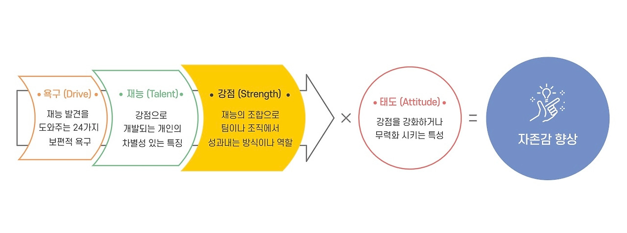 태니지먼트는 자신의 재능과 강점을 제대로 알고, 그것을 개발/활용함으로써 일에 대한 탁월성을 높이고 자존감을 회복할 수 있다고 이야기합니다.