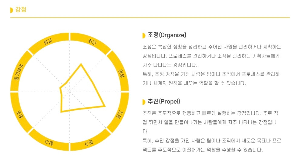 재능이 각각 차별적인 힘을 나타낸다면, 강점은 발견된 재능들의 조합으로서 조직의 성과에 공헌할 수 있는 방식이나 역할을 의미합니다. 태니지먼트에서는 강점의 유형을 추진 / 완성 / 조정 / 평가 / 탐구 / 창조 / 동기부여 / 외교 8가지로 정의하고 있습니다.