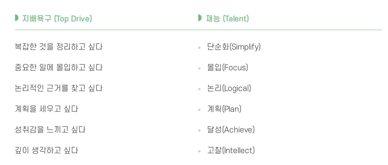 욕구 중에서도 만족감이나 지속성, 학습 속도가 강하게 나타는 차별적인 힘입니다. 재능은 욕구와 연결되어 있어서 만족감을 동반하고, 지속성과 빠른 학습 속도를 끌어냄으로써 개인의 강점으로 개발될 수 있는 요소입니다.