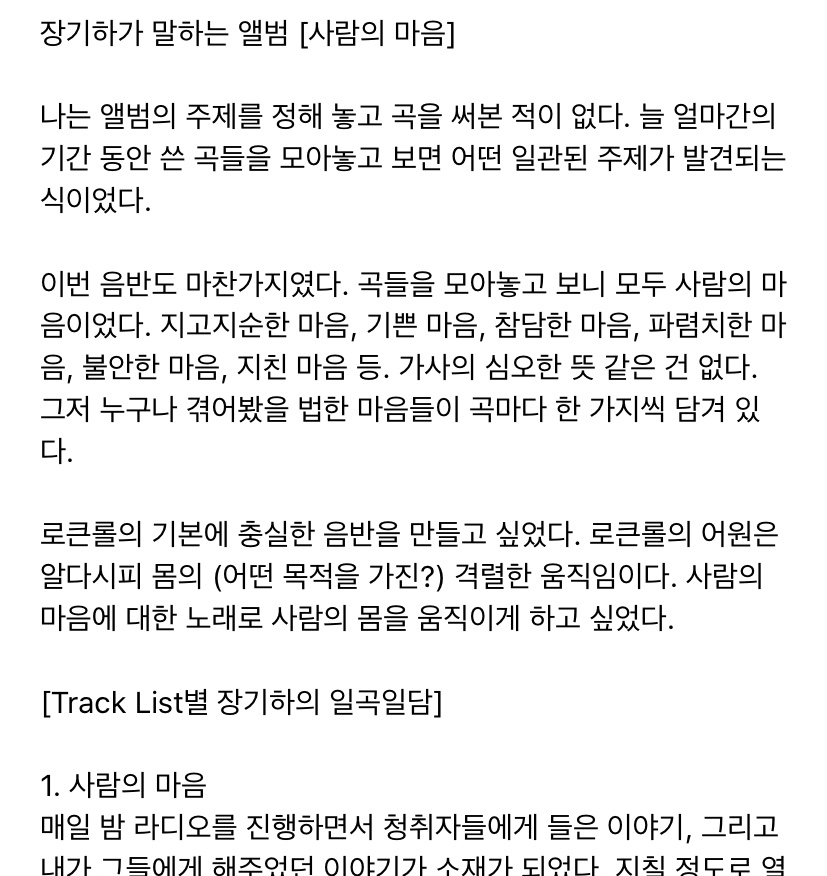 여느 때처럼 운전석에 앉아 노래를 골랐다. '장기하와 얼굴들'의 앨범을 뒤늦게 정주행 하던 중이었다. 정규 3집 <사람의 마음>을 리스트에 담았다. 앨범과 제목이 같은 '사람의 마음'이라는 노래가 첫 곡으로 흐른다.