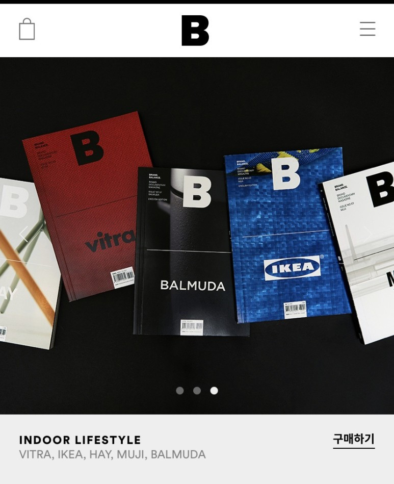 ‘B’는 브랜드(Brand) 와 밸런스(Balance)를 의미합니다. 매거진<B>는 실용성, 아름다움, 합당한 가격, 고유의 철학이라는 네가지 축의 균형을 이루고 있는 브랜드의 이야기를 담습니다. 2011년 11월에 창간되어 현재 84호까지 발행되었는데, 지금까지 유튜브, 지샥, 블루보틀, 샤넬, 반스, 화요, 이케아 등 분야에 관계없이 <B>의 관점에 부합하는 다양한 브랜드를 다루었습니다.