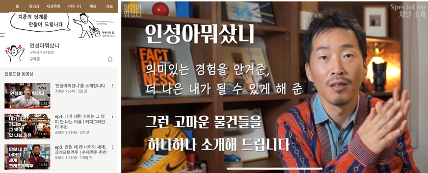 - 유튜브 채널 '인성아 뭐샀니' ( https://www.youtube.com/earthwide )