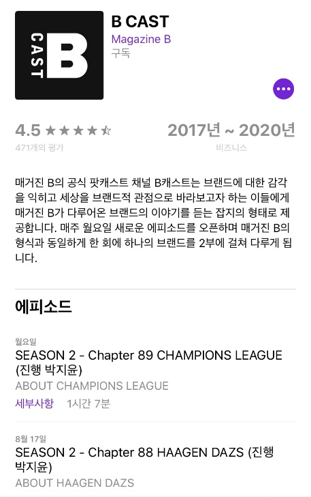 비캐스트(BCAST) 라는 이름의 공식 팟캐스트도 운영하고 있습니다. 잡지의 주요 내용을 조수용 발행인의 아내인 가수 박지윤씨가 읽어주는 오디오 클립인데요. 무료 컨텐츠이지만 그 깊이가 절대로 얕지 않습니다. 한 편당 60분 내외의 긴 분량으로 제작되어 한가지 브랜드에 대한 매우 세밀한 이야기와 인터뷰를 담고 있습니다. 팟빵 어플리케이션이나, 애플 팟캐스트, 공식 유튜브 채널을 통해 즐기실 수 있습니다.
