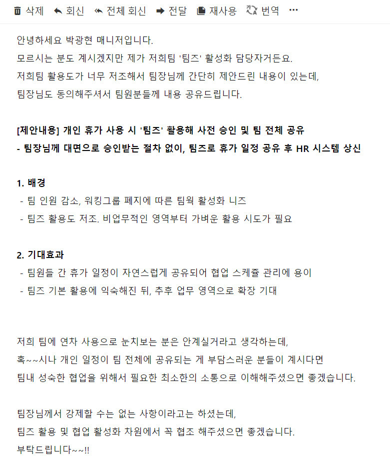 다행히 팀장님도 제안에 동의해 주셨고, 팀 동료들에게 메일을 썼습니다.