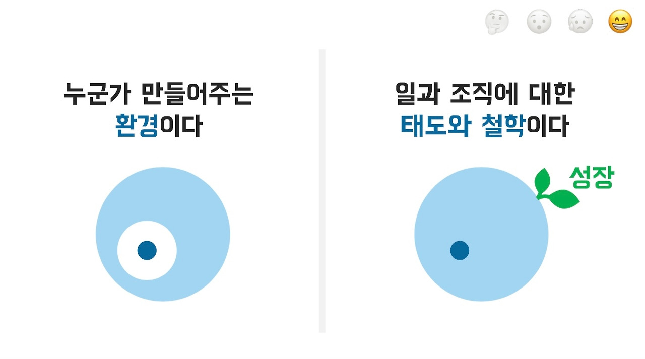 이런 환경의 변화를 위해서 개인이 할 수 있는 일은 별로 없습니다. 그래서 조직문화를 바꾸자, 더 좋은 문화를 만들자는 이야기에 이렇다 할 동기부여가 되지 않습니다. 조직문화를 의존적, 수동적으로 이해하는 관점입니다.