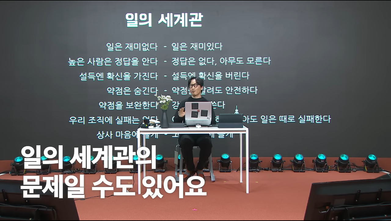 강연에서 '일의 세계관'이라는 재밌는 표현을 쓰셨습니다. 함께 일하기 어려운 사람이 있다면 그건 일의 세계관 문제일 수 있다. 일에 대한 같은 세계관을 가진 사람과 일할 때 더 즐겁게 일할 수 있다. 는 내용이었습니다.