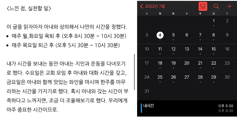 이 내용을 읽은 날 밤, 아내를 앞에 앉혀놓고 평일 저녁에 혼자만을 위한 시간을 갖고 싶다고 이야기했습니다. 한두 시간이 아니라 세 시간 이상의 덩어리 시간으로요.