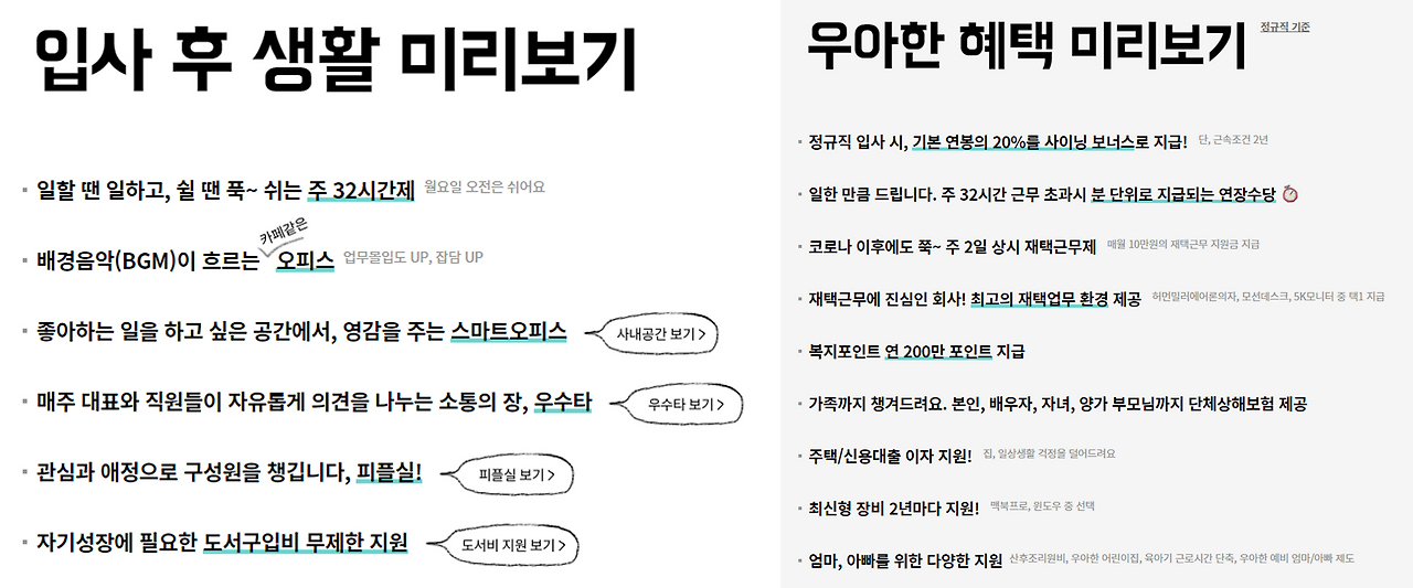배민에는 또 어떤 복지가 더 있는지 궁금해서 찾아봤어요. 주 32시간제, 월요일은 오후부터 근무, BGM이 흐르는 사무실, 로봇이 커피를 배달해 주는 최신식 스마트 오피스, 입사 땐 기본 연봉의 20% 샤이닝 보너스, 분 단위로 지급되는 연장수당, 매월 10만 원의 재택근무 지원금, 가족을 포함한 단체 상해보험까지. 정말 좋긴 좋네요. 저도 가서 일해보고 싶다는 생각이 당장 들었습니다.
