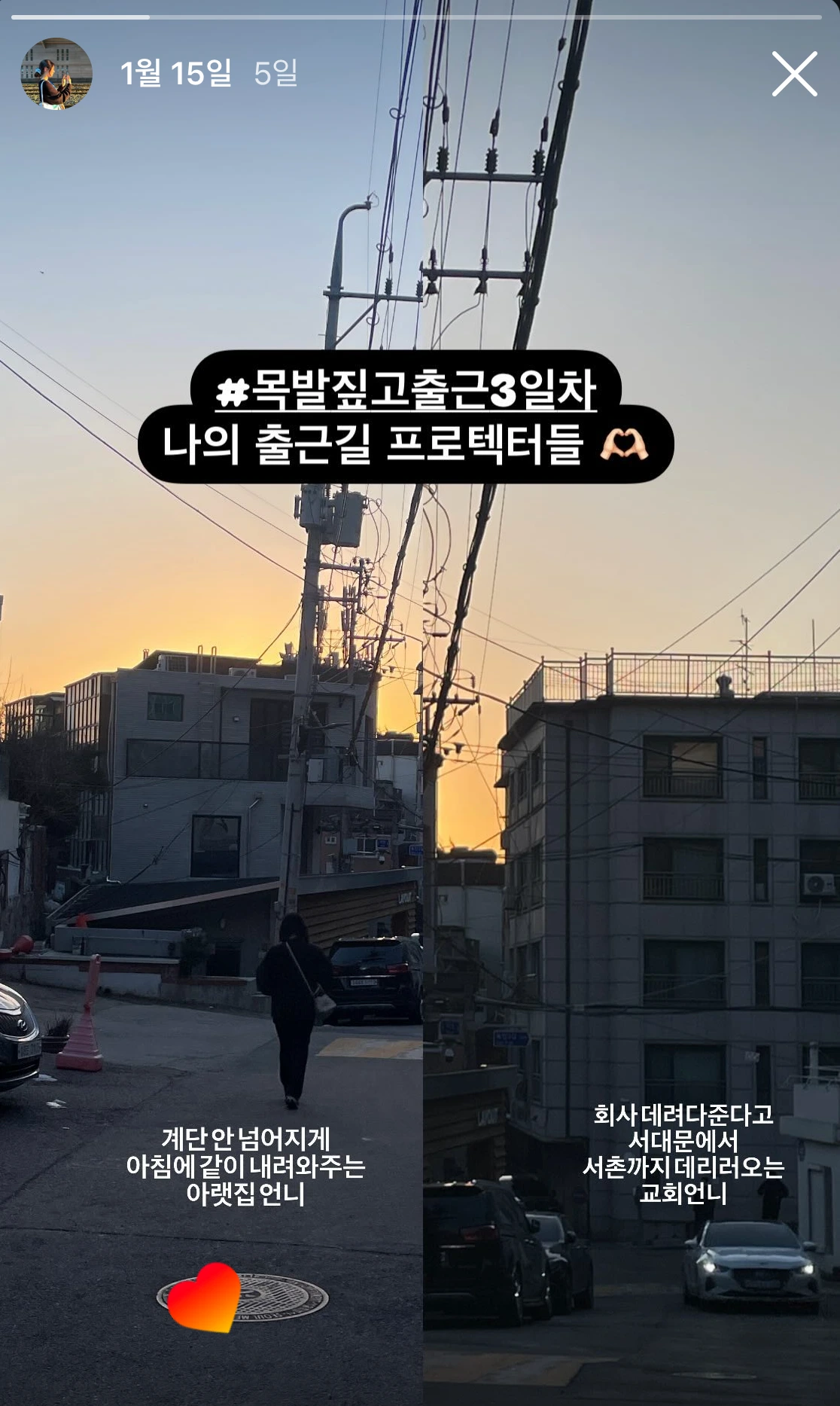 내 소리를 듣고 올라온 언니에게 한쪽 목발을 맡긴다. 왼손은 목발, 오른손은 손잡이를 잡아야 하니까. 나를 아이 쳐다보듯 유심히 살피며 계단을 모두 내려올 때까지 지켜봐 주는 언니 덕에 오늘 출근길은 어제보다 훨씬 더 수월했다. 경사길을 다 내려올 때까지 긴장을 늦추지 않는 언니의 따뜻한 배려에 아침 추위가 하나도 느껴지지 않았다. 마을 버스정류장으로 향하는 언니의 뒷모습을 바라보며 막 붉게 피어오른 아침 하늘을 사진에 담고 있는데 어제보다 조금 이르게 나에게 오고 있는 M언니의 차! 서대문에서 서촌까지 데리러 와주는 교회 언니다.
