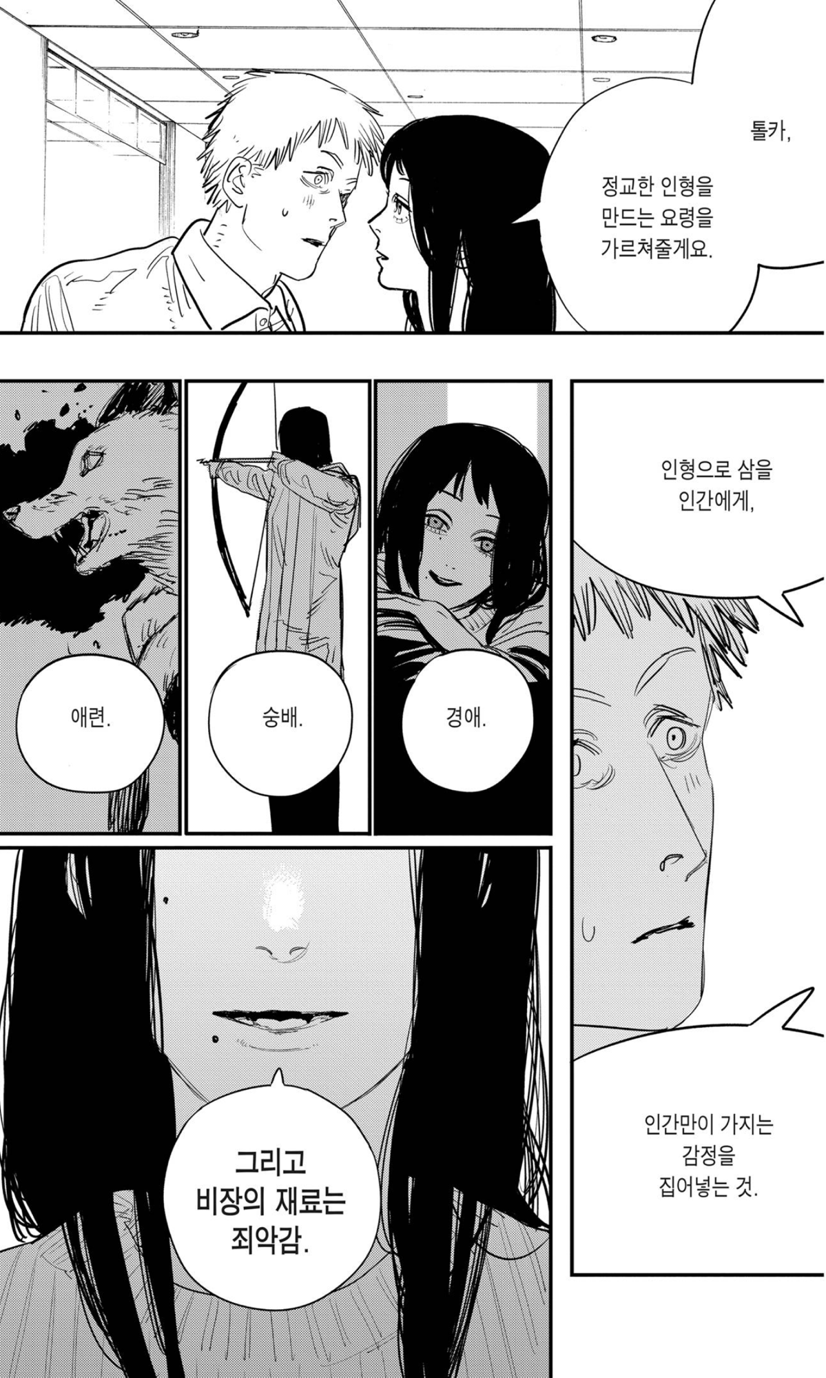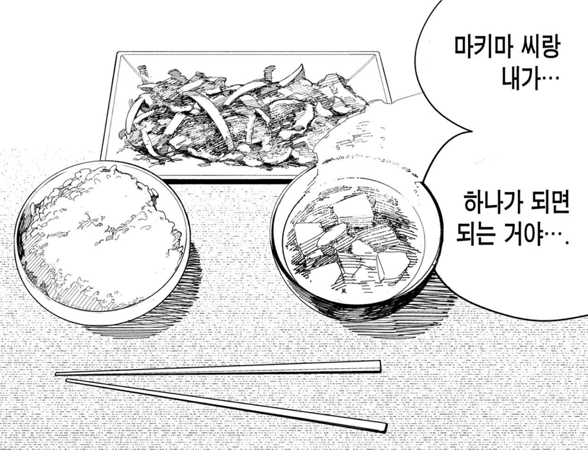 닿지 못한 사랑은 그녀를 죽이고 나서야 비로소 음식이 되어 혀 끝에서 맴돌죠. 그제야 덴지는 그녀의 머리카락부터 발끝까지 육신의 온기를 쓸쓸히 되새기며 말합니다. "마키마 씨는 이런 맛이구나" 이토록 뒤늦은 고백은 사랑의 완성일까요. 아니면 잔혹한 환상의 종말일까요.