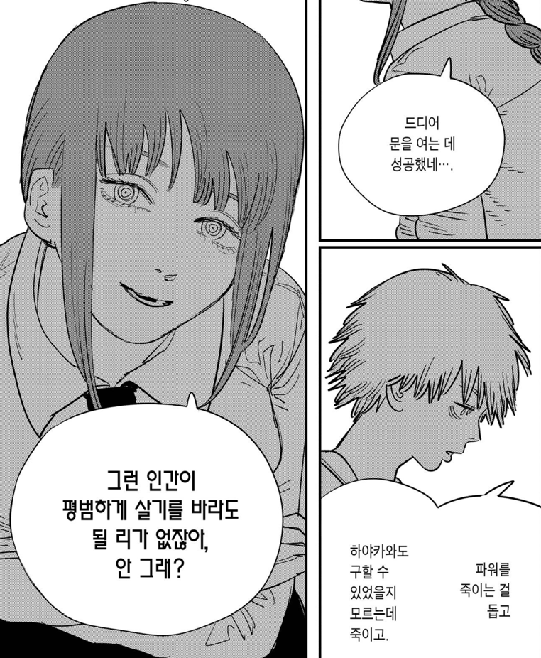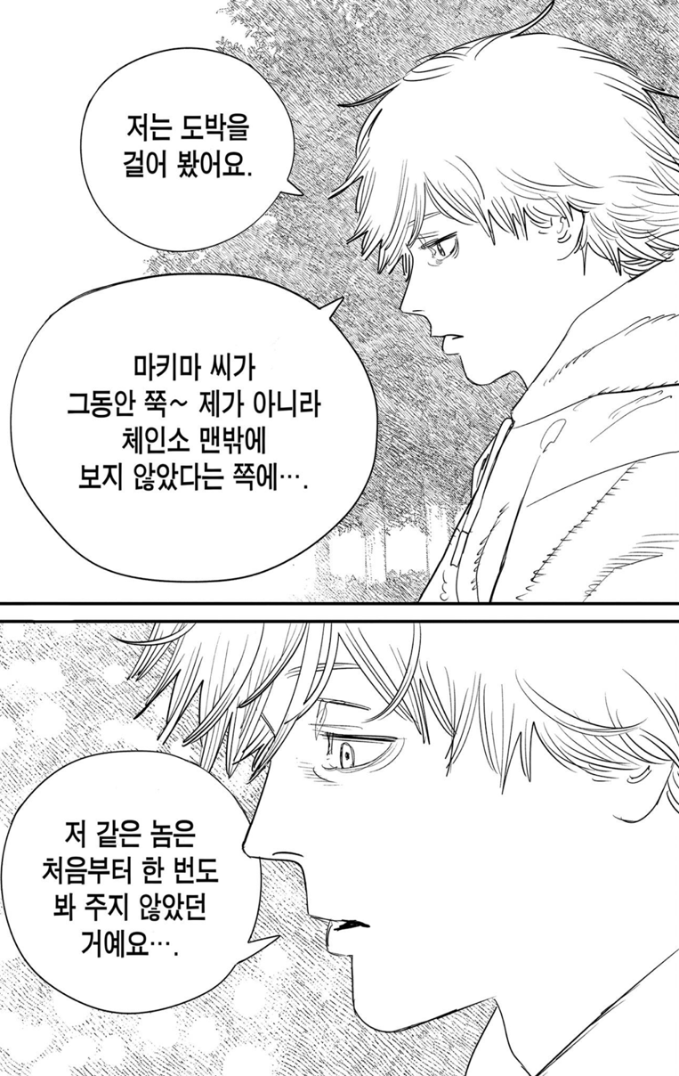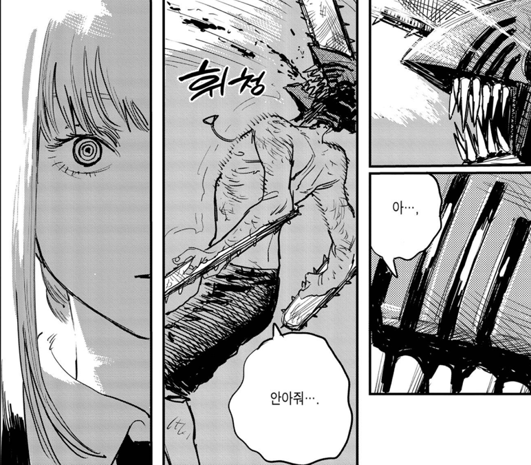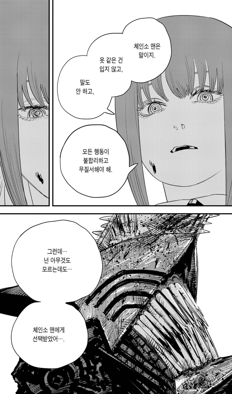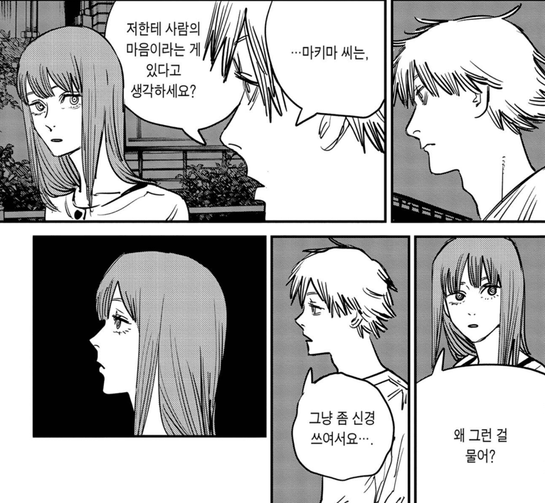 잔인하게도 마키마는 덴지에게 경멸에 가까운 말들을 내뱉습니다. 자신과 체인소맨의 관계를 방해하지 말고 불쾌하니 그냥 죽어버리라고 하죠. 하지만 아이러니하게도 그건 덴지가 아닌 포치타, 즉 체인소맨 이었습니다. 자신이 그토록 열렬히 동경한 대상이 코앞에 있는데도 못 알아보고 저주를 퍼붓죠.