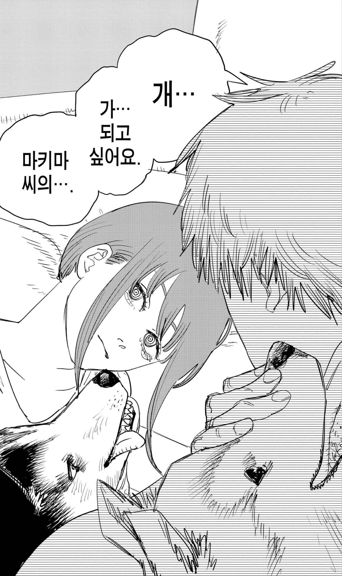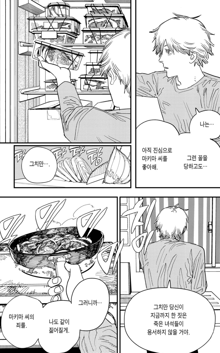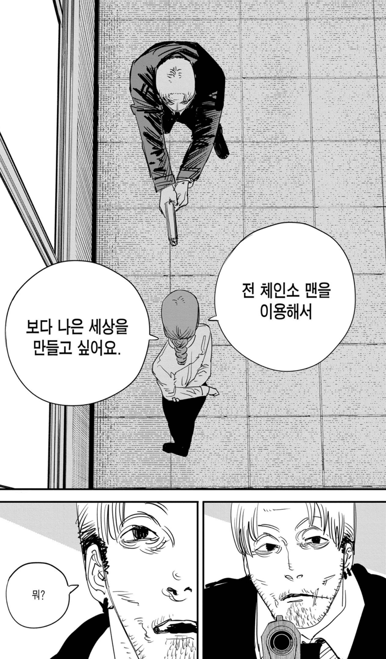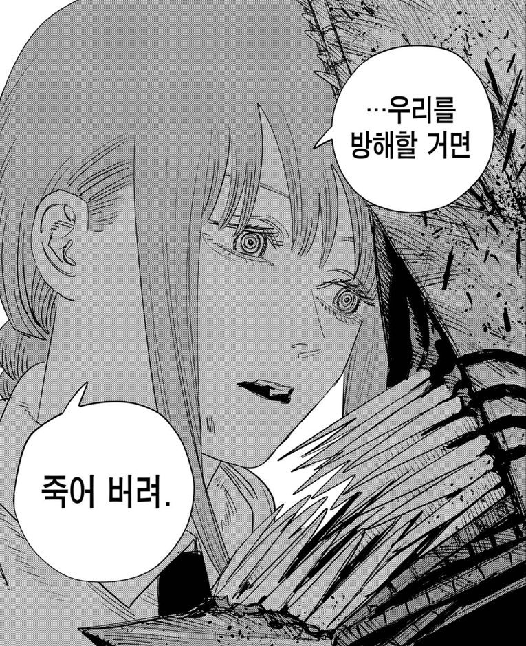 잔인하게도 마키마는 덴지에게 경멸에 가까운 말들을 내뱉습니다. 자신과 체인소맨의 관계를 방해하지 말고 불쾌하니 그냥 죽어버리라고 하죠. 하지만 아이러니하게도 그건 덴지가 아닌 포치타, 즉 체인소맨 이었습니다. 자신이 그토록 열렬히 동경한 대상이 코앞에 있는데도 못 알아보고 저주를 퍼붓죠.