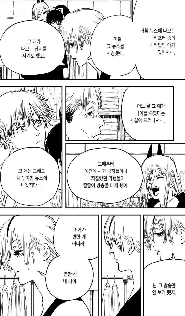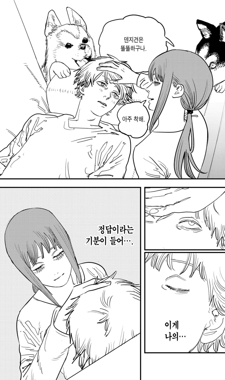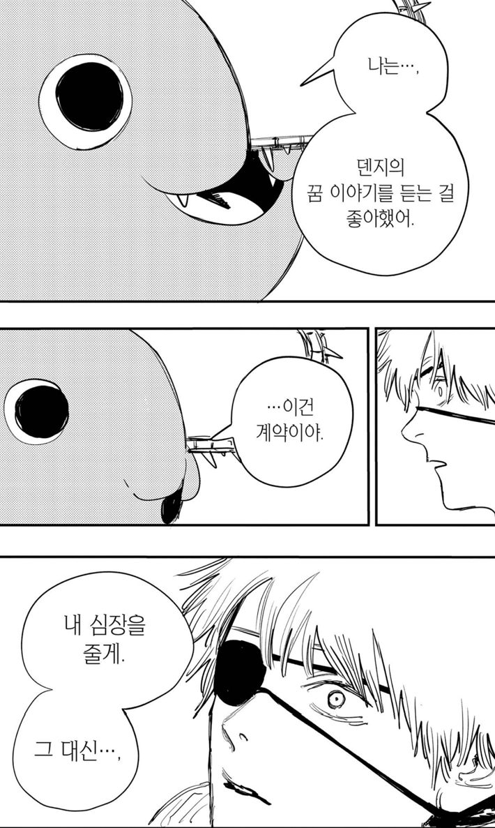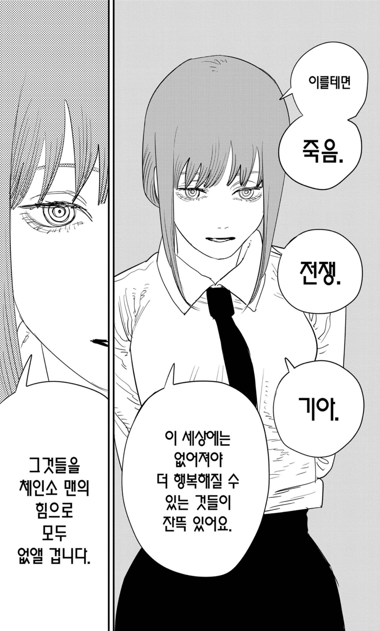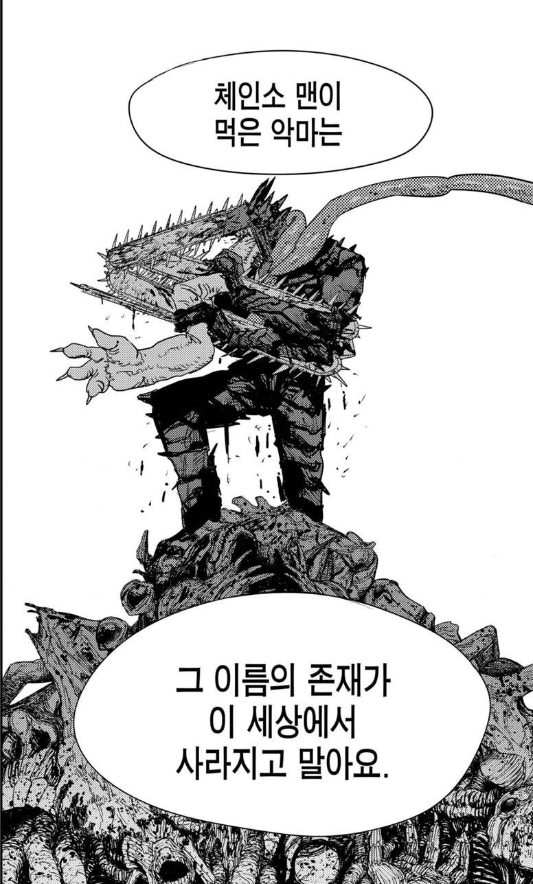 하지만 지배 악마의 존재는 소멸하지 않았습니다. 체인소맨이 아니라 덴지였기 때문일까요. 이제 그는 지배로부터 벗어난 자유로운 인간이지만 그 눈빛은 어딘가 서글퍼 보입니다. 아마도 사랑받지 못한 슬픔과 그리움이 뒤섞여 덴지를 따라다니는 걸지도 모르겠습니다. 과연 덴지는 꿈을 찾아 진정 자신의 삶의 주인이 될 수 있을까요?