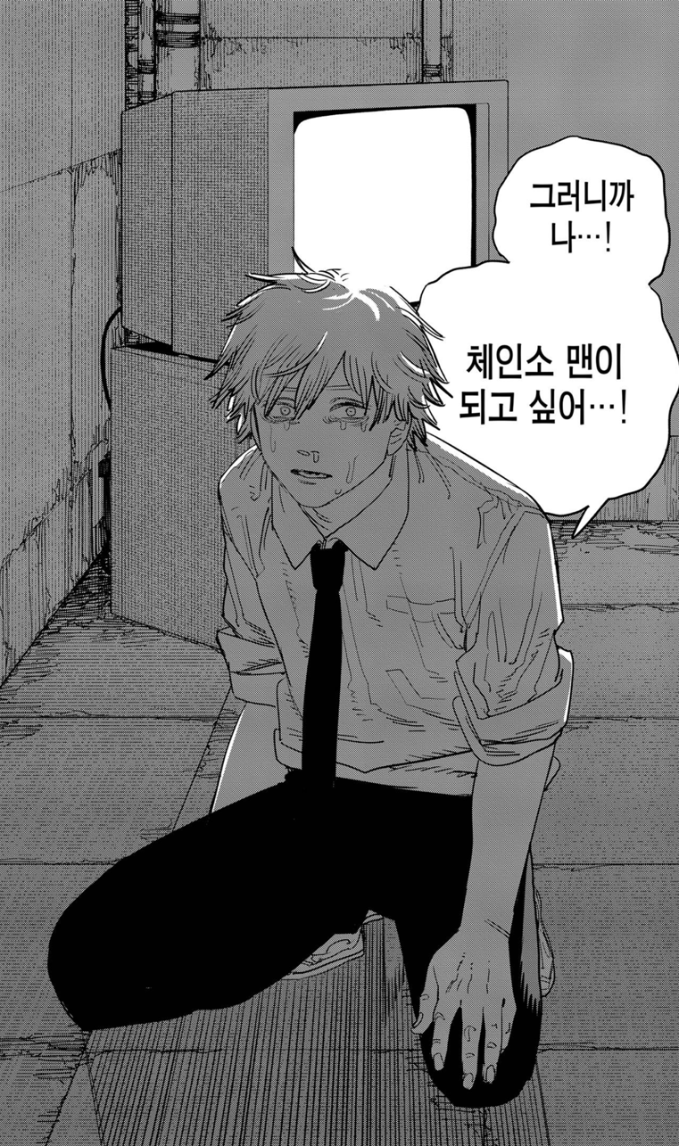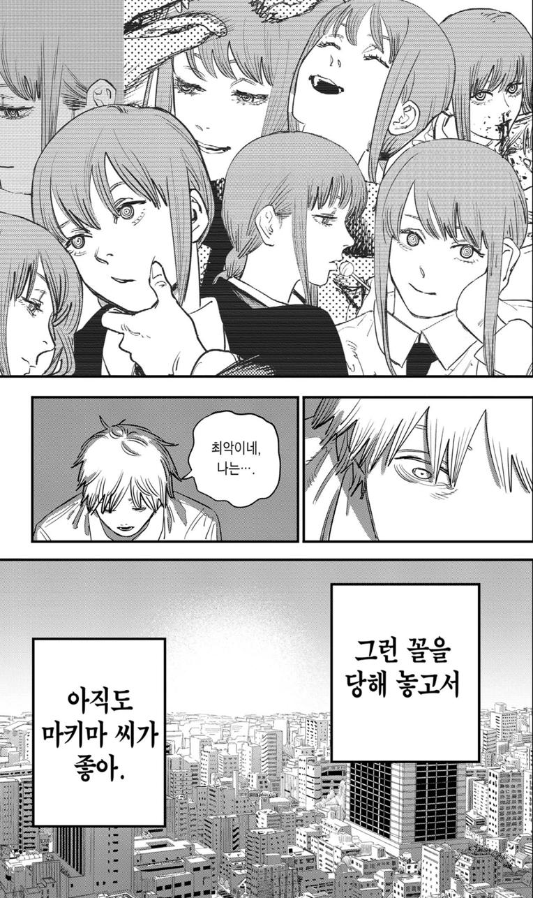 가장 좋아했던 사람을 직접 죽여야만 하는 비극. 그 속에서 덴지는 사랑이라는 길고 질긴 목줄을 끊어냅니다. 덴지, 마키마, 체인소맨. 이 뒤틀린 삼각관계는 결국 파국을 맞고 끝이 나죠.