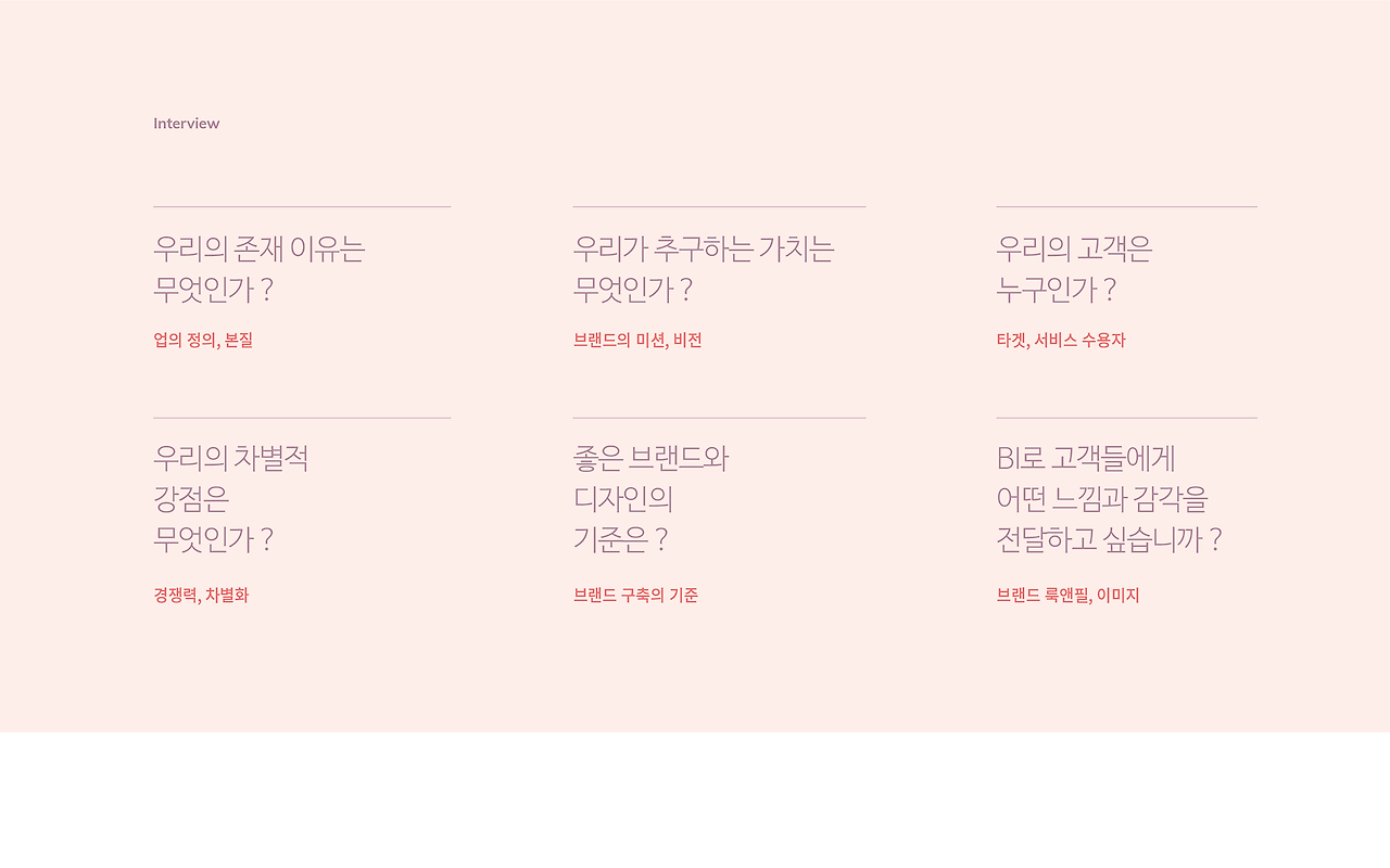 브랜드아이덴티티 작업에 있어서 클라이언트와의 인터뷰는 시작이자 끝이라는 생각을 많이 합니다.