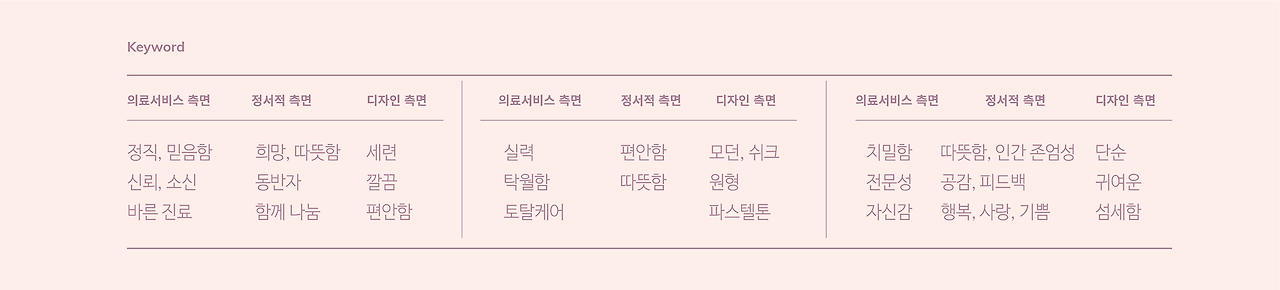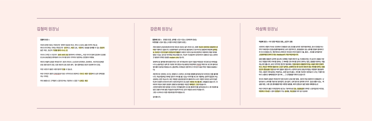 세분의 원장님께서 인터뷰 질문에 대한 답변들을 꼼꼼히 해주셨습니다. 그 내용들에서 키워드들 추출하여 브랜드의 정체성과 방향성을 확립해 갔습니다. 사실 시각적인 방향성을 빼면 브랜드의 뼈대가 되는 모든 내용들이 인터뷰를 통해 나왔습니다. 뿐만 아니라 이 과정을 통해 실제 디자인에 서로의 공감대를 만들고, 신뢰를 쌓을 수 있는 좋을 기회가 됐습니다.
