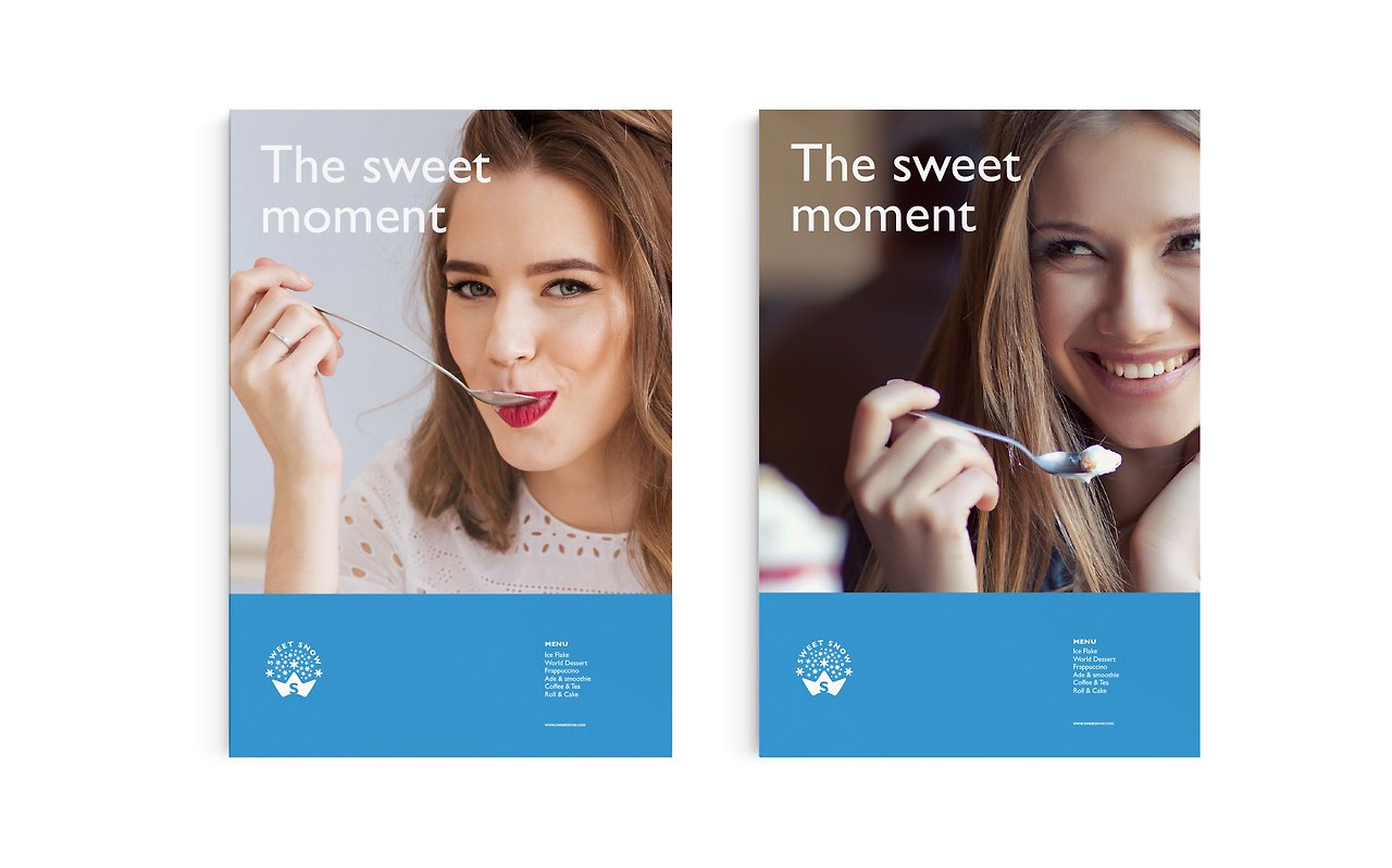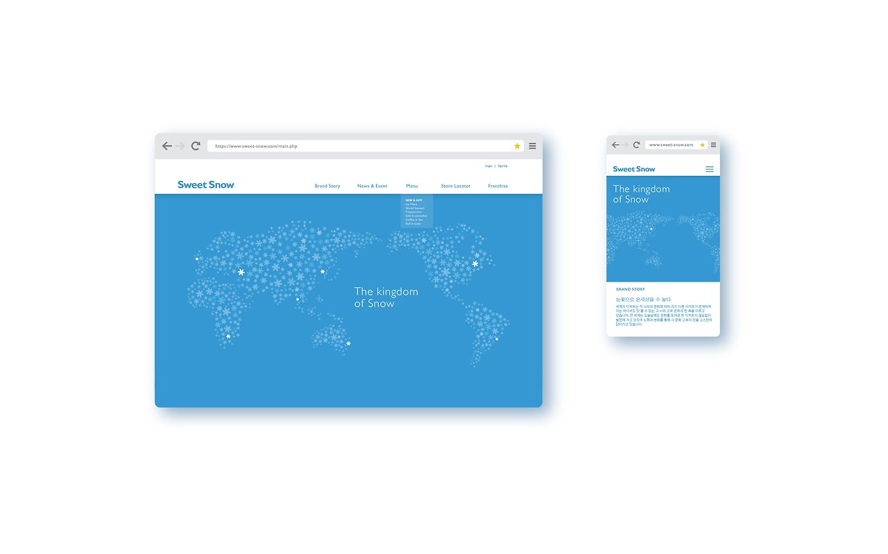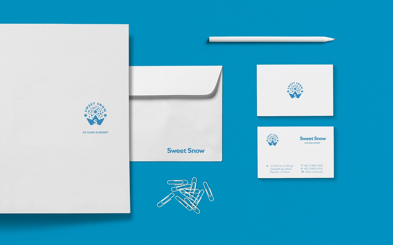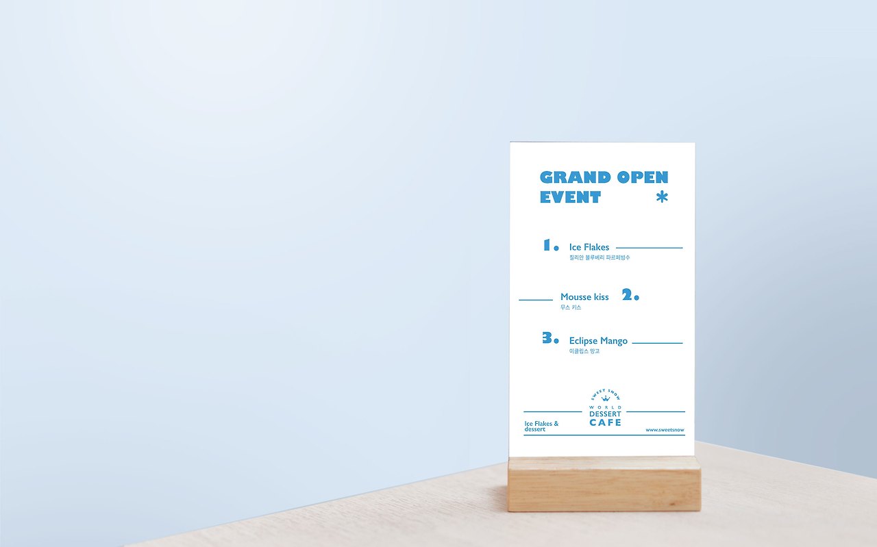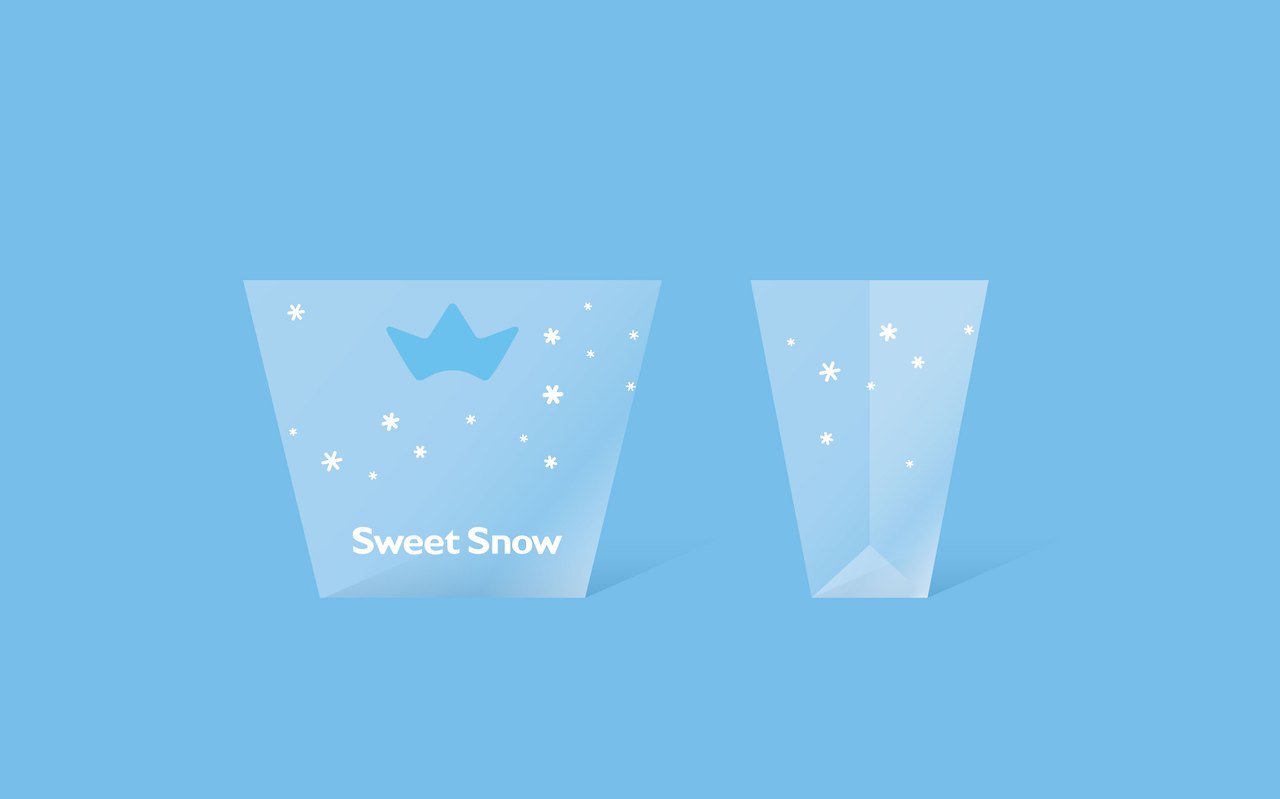 넘쳐나는 빙수 시장에서 쉽고 기억하기 좋으며 명칭 자체에서 브랜드의 컨셉과 개성을 잘 표현하고자 하였습니다. 'Sweet'는 디저트를 먹을 때의 달콤한 순간을, 'Snow'에는 빙수의 부드러운 맛과 촉감을 느낄 수 있는 키워드입니다. 빙수와 디저트를 함께 전달하면서도 [S-] 발음의 반복으로 인해 회상력과 리듬감을 더욱 살렸습니다.