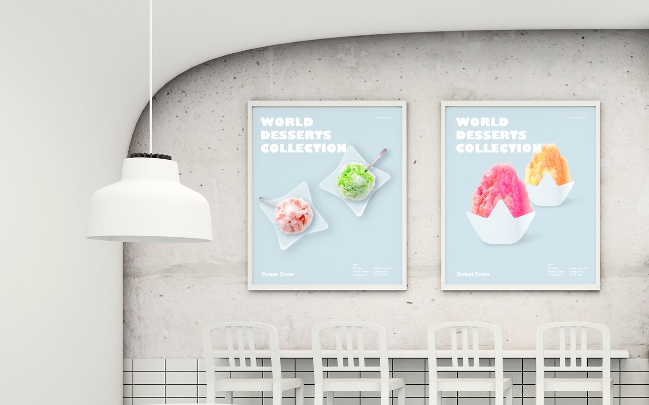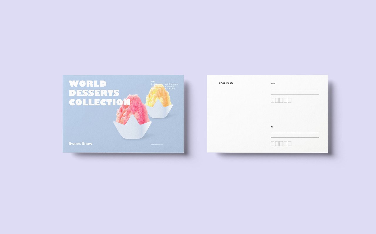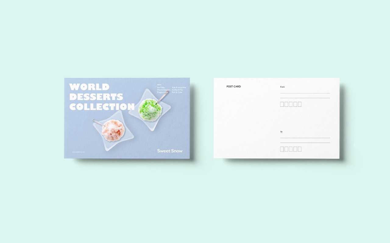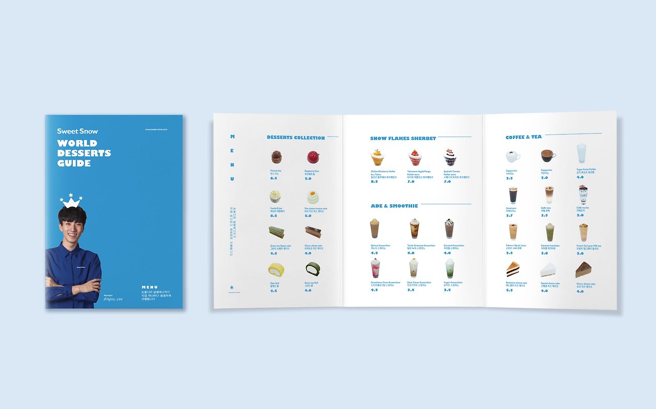 스위트스노우는 빙수를 중심으로 세계 각나라의 디저트를 소개하는 프랜차이즈형 카페입니다. 난립한 빙수 시장상황에서 확실한 차별적 소구점이 필요했습니다. 빙수 전문점을 기반으로 하되 아직 시장 전반으로 확대되지 않은 디저트 시장을 함께 겨냥해 브랜드를 런칭하고자 하였습니다. 이는 여름 시즌에만 한정적일 수 있는 빙수전문점의 약점을 보완한 전략이기도 했습니다.
