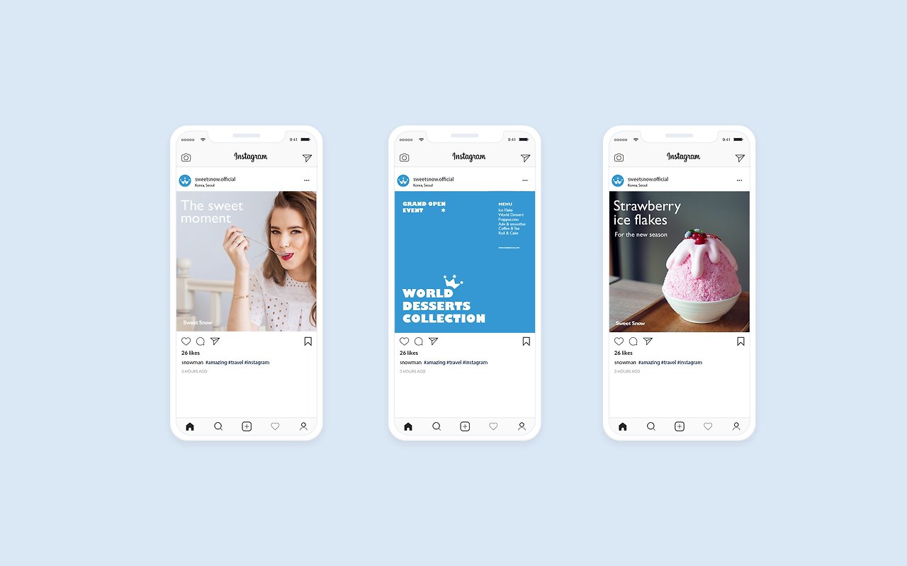 스위트스노우만의 사진과 텍스트가 배치되는 방식을 연구했습니다. 과감한 이미지 배치와 Blue바를 활용하여 브랜드아이콘과 메세지가 확실하게 전달하게 하였습니다.