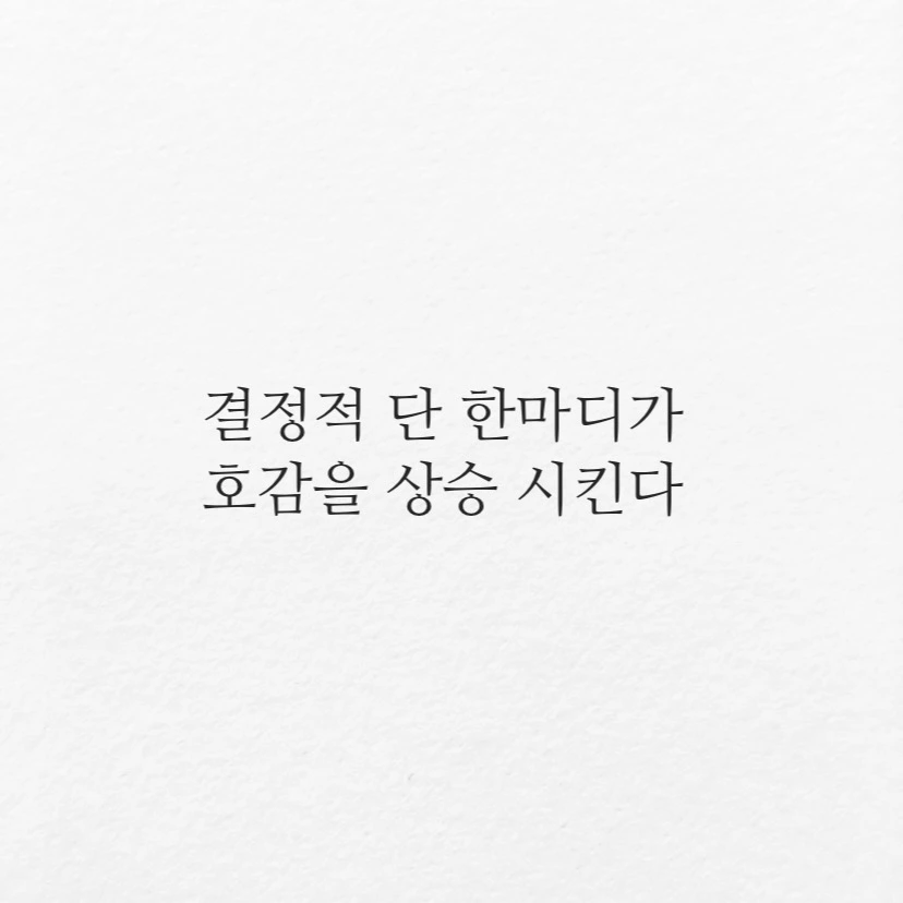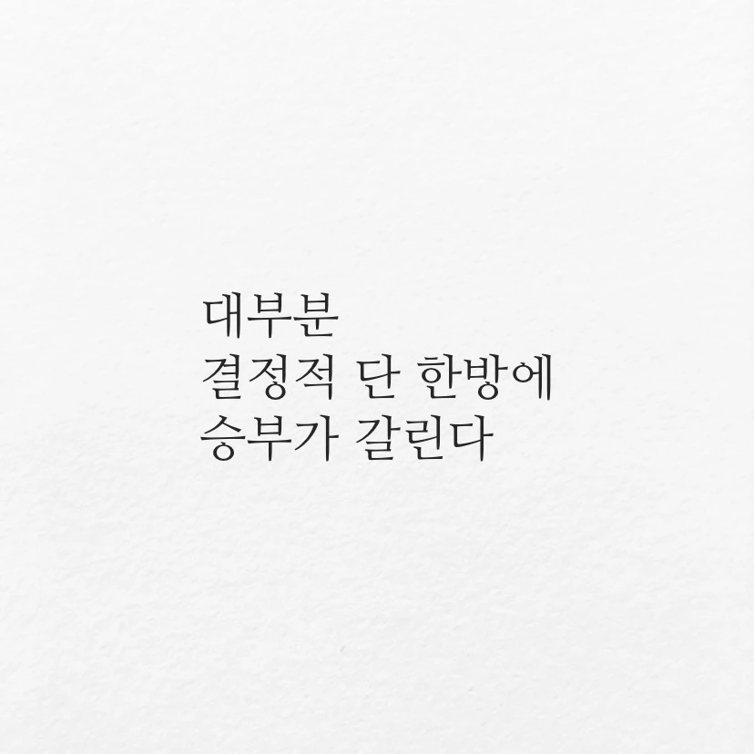 결정적 단 한마디가호감을 상승 시킨다.결정적 단 한번의 행동이믿음을 준다.결정적 단 한파트가히트 곡을 가른다.대부분 결정적 단 한방에승부가 갈린다.결국 내가 하는모든 글과 말과 행위도그 결정적 단 하나를 위한 발버둥 아닐까.힘들어도 지쳐도계속 버둥버둥할 수 있는 건점점 앞으로 나아가고 있다는 착각 때문일지도 모르겠다.