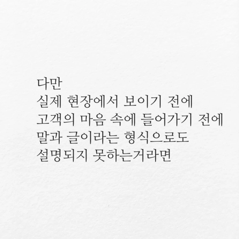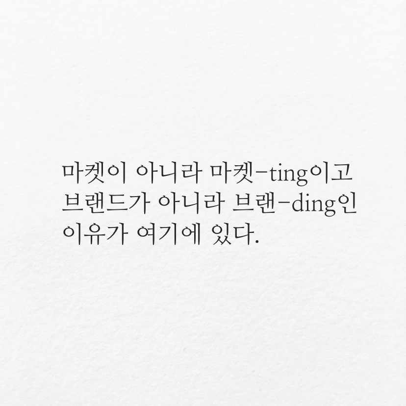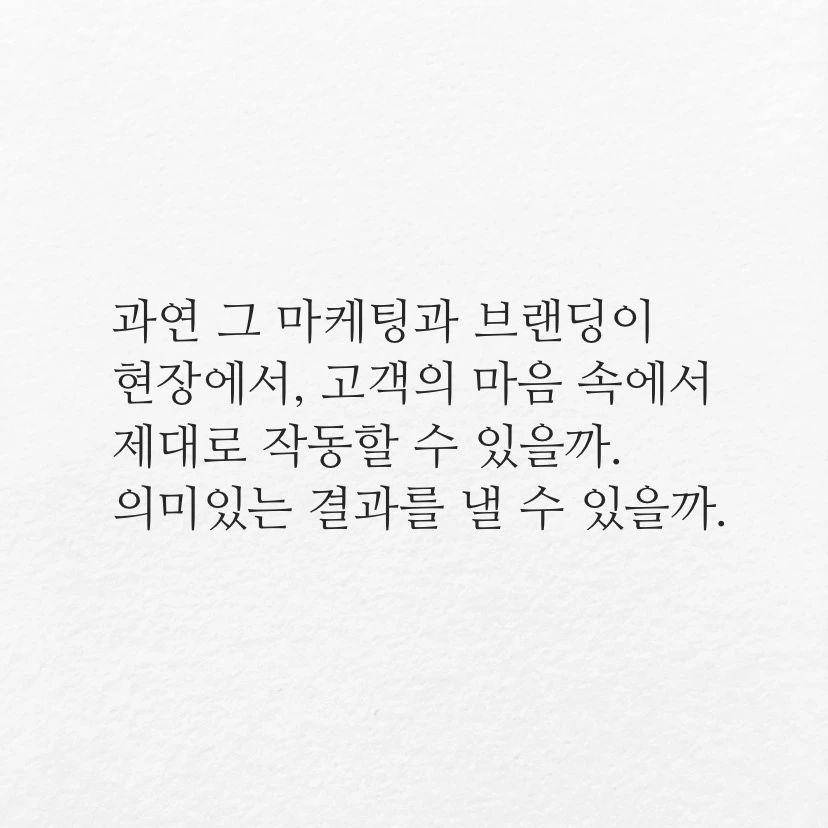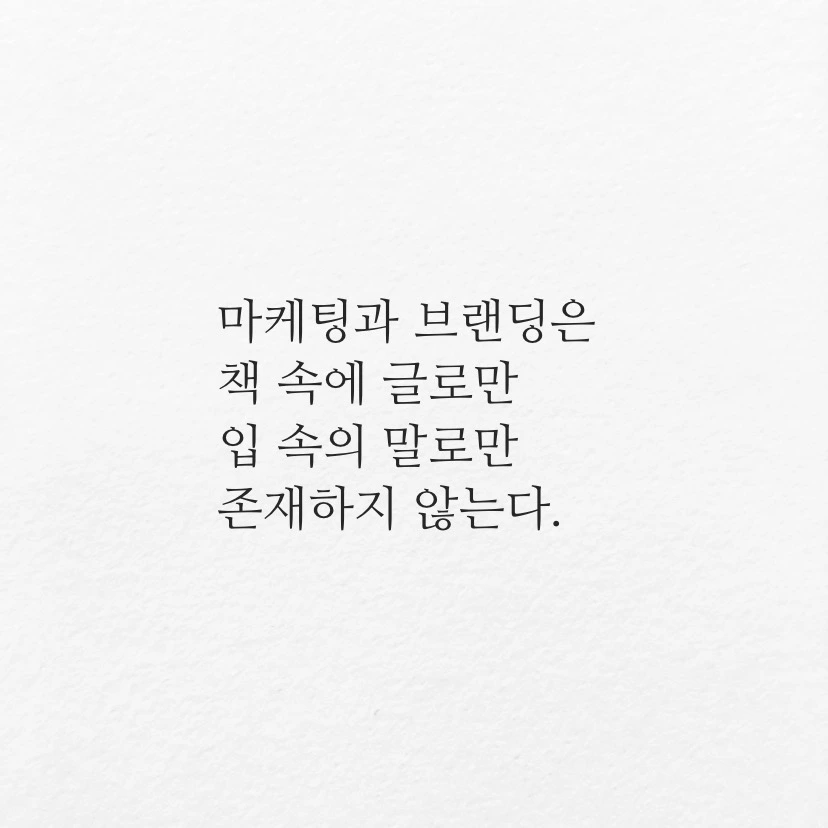마케팅과 브랜딩은 책 속에 글로만입 속의 말로만존재하지 않는다.실제 현장에서 고객의 마음 속에서생물처럼 살아 움직인다.마켓이 아니라 마케-ting이고 브랜드가 아니라 브랜-ding인이유가 여기에 있다.다만실제 현장에서 보이기 전에고객의 마음 속에 들어가기 전에말과 글이라는 형식으로도 설명되지 못하는거라면과연 그 마케팅과 브랜딩이현장에서, 고객의 마음 속에서제대로 작동할 수 있을까.의미있는 결과를 낼 수 있을까.