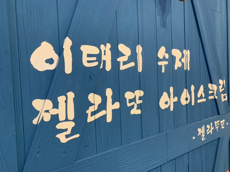 첫번째로 눈에 띈 서체는 매장 입구 메인의 손글씨였습니다. ‘수제’라는 제품의 특징을 강조하기 좋은 서체입니다. 캘리그라피라는 문자 표현은 인공적이지 않고 자연의 방식으로 만들었다는 메세지를 표현하기에 참 적절해 보입니다. 파란색 페인트로 손수 칠한듯한 벽면은 이탈리아 반도를 둘러싸고 있는 지중해의 물빛을 닮았네요. 그 위에 흰색으로 써서 더 시원한 기분이 납니다.