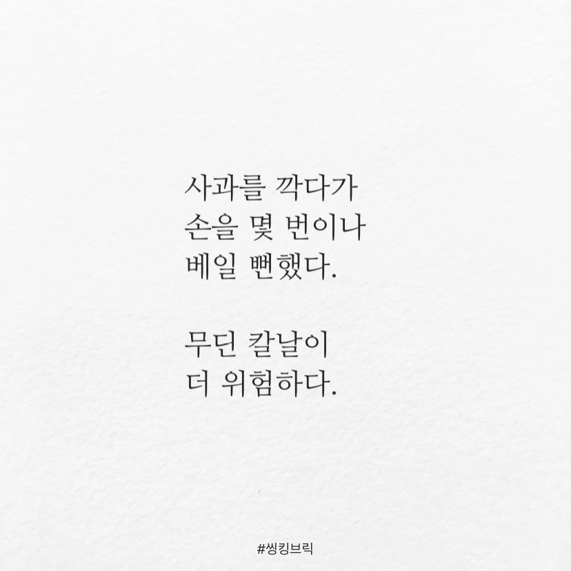 사과를 깍다가 손을 몇 번이나 베일 뻔했습니다.날카로운 칼날이 더 위험할 줄 알았는데,그 게 아니더군요.무디고 녹슨 칼이 더 위험합니다.맞습니다.예리함이 사라진 사업적 판단이 가장 위험합니다.이제는 무뎌져서 별 감흥이 없을 때의남녀 관계도 위험합니다.위험하지 않으려면오히려 끊임없이 갈고 닦아서날이 바짝 서게만들어야합니다.