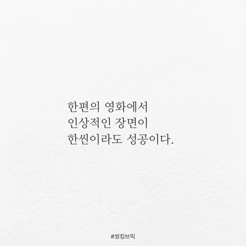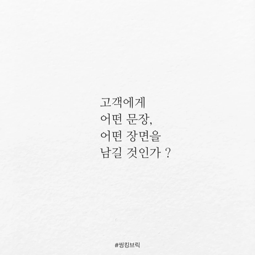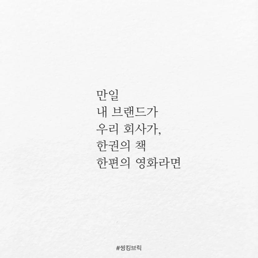 한권의 책에서도움이 되는 문장이한줄이라도 충분하다.한편의 영화에서인상적인 장면이 한씬이라도 성공이다.만일내 브랜드가우리 회사가한권의 책, 한편의 영화라면고객에게어떤 문장,어떤 장면을남길 것인가 ?#씽킹브릭