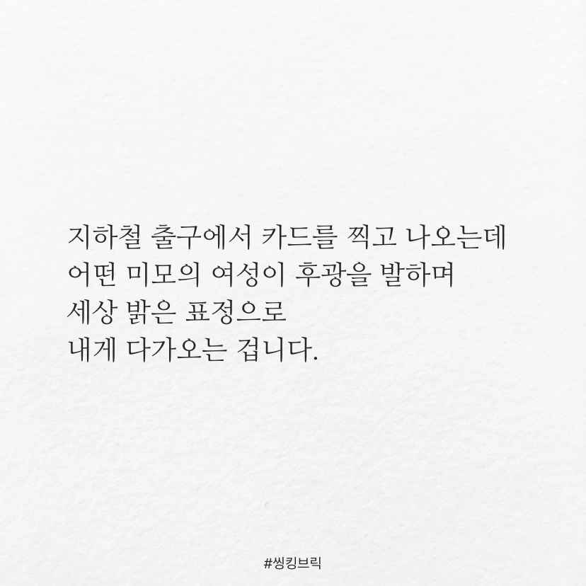 지하철 출구에서 카드를 찍고 나오는데어떤 미모의 여성이 후광을 발하며세상 밝은 표정으로내게 다가오는 겁니다.순간 너무 당황스러워뒷걸음을 쳤는데,,,내 뒤에 그 여성의 모습을 흐뭇하게 지켜보는남친이 있었다는,,,크리스마스 이브같은이야기입니다.