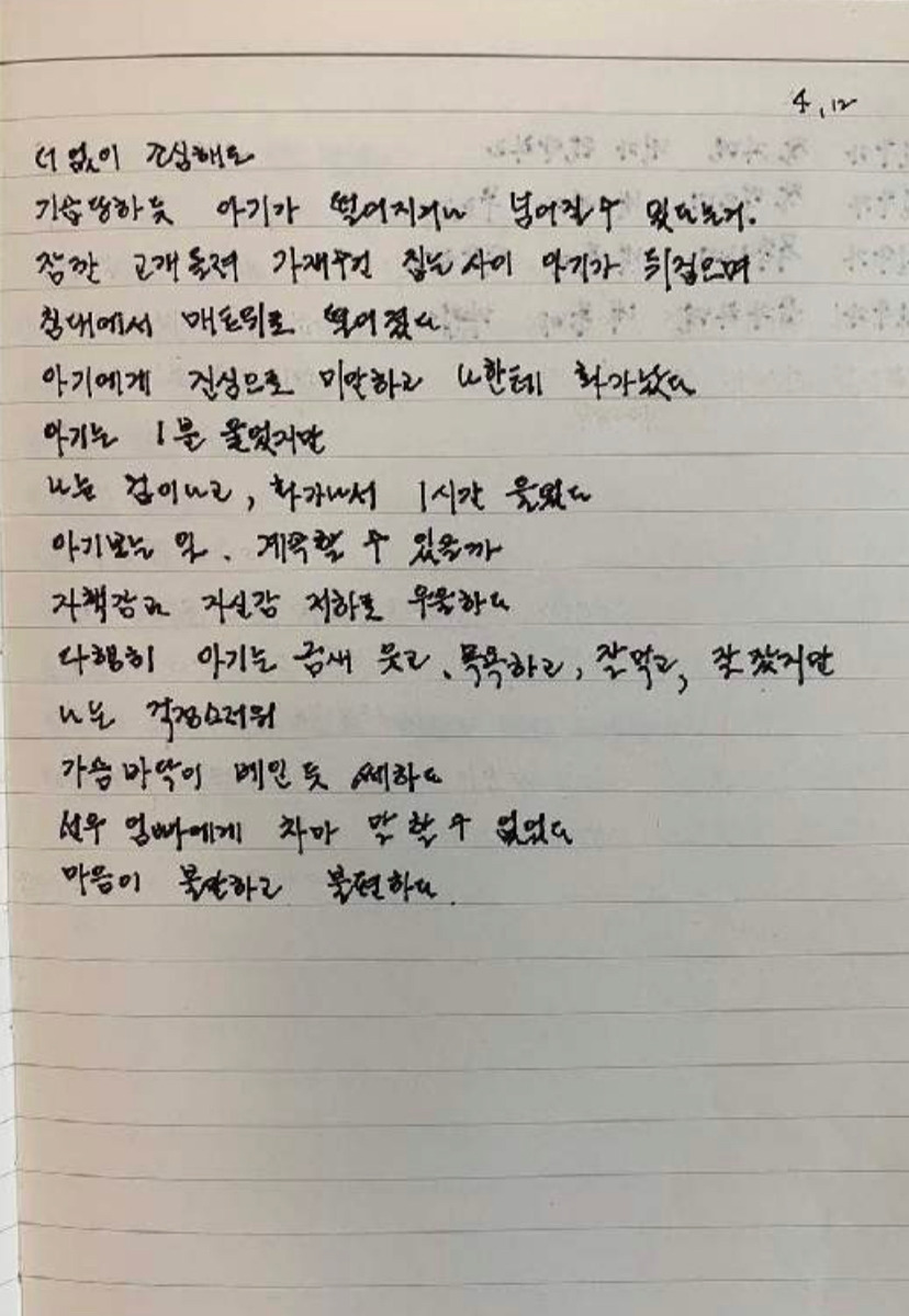 놀랍게도 2년간 쓰신 육아일기였습니다. 저는 쓸 생각도 엄두도 안났는데 너무 감사했습니다. 이모님을 보내드리고 200페이지가 넘어가는 글을 보면서 아내와 저는 얼마나 울었는지 모릅니다. 그 뒤로 집안의 가보로 남기겠다며 주방에서 가장 잘 보이는 선반 위에 올려놨는데요. 어쩌다 그 일기를 넘겨 볼 깨면 아내도 나도 주체할 수 없는 눈물 때문에 정말 눈물 젖은 밥을 먹을 때가 한 두번이 아닙니다.